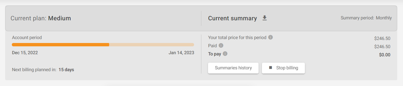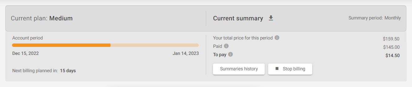請求書は最初は複雑に見えるかもしれませんが、重要なポイントを理解すれば仕組みについて疑問はなくなるでしょう。最も重要なのは、アカウントの実際の使用量に対してのみ料金をお支払いいただくという点です。隠れた費用は一切なく、すべての有料オプション機能は料金ページに記載されています。請求システムは、使用料を前払いする前払い方式で機能します。