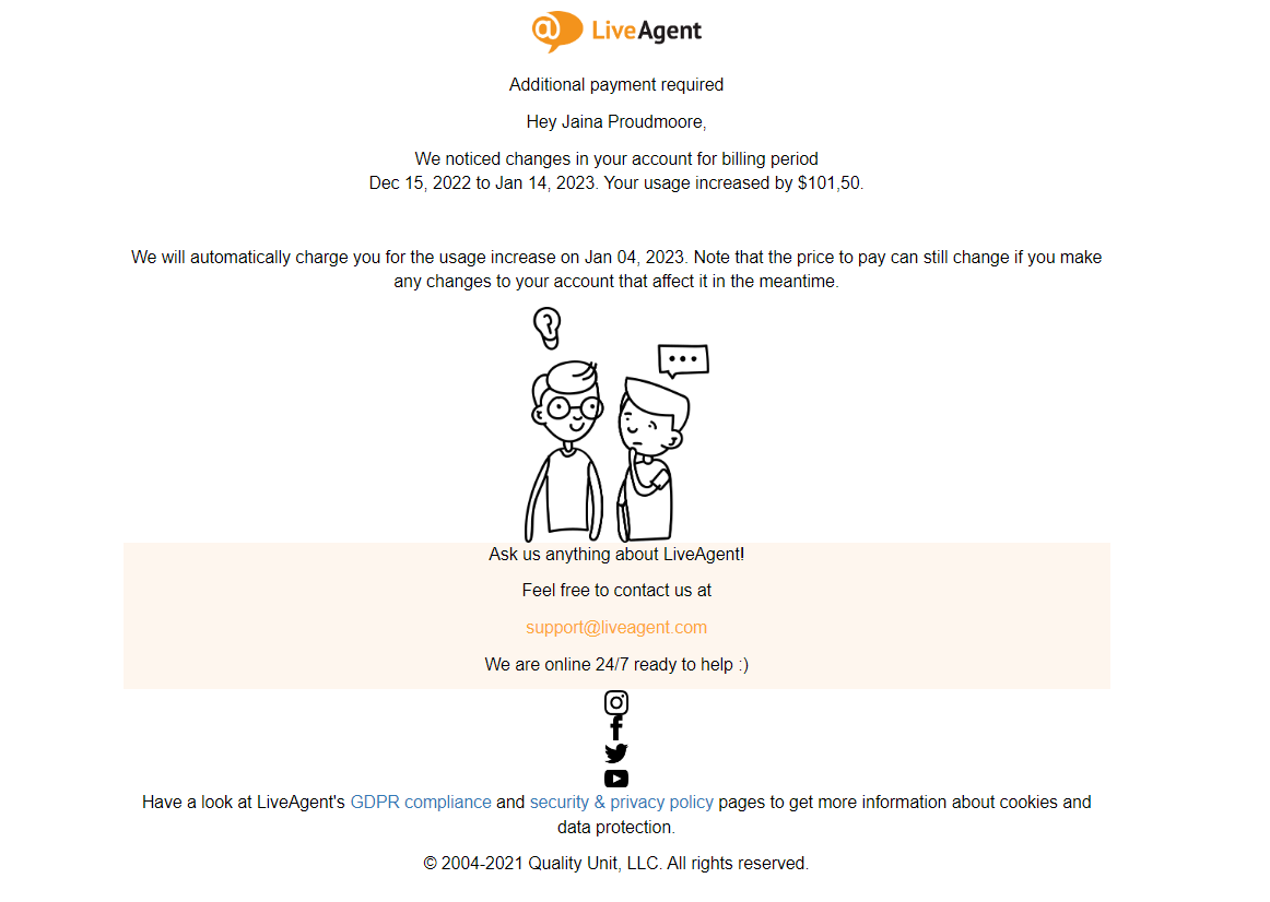 アカウントの使用量を増やした場合(新しいエージェントの追加、プランに含まれていない有料アドオンの追加、または上位プランへのアップグレード)、システムはLiveAgentアカウントの使用料金を再計算します。再計算では、新しい金額がすでに支払い済みの金額より少なくとも10%高く、かつ現在の請求期間においてすでに支払い済みの金額より少なくとも$20高いかどうかが確認されます。両方の条件が満たされた場合、追加支払いが要求され、新しい使用状況と追加支払いに関するメール通知がLiveAgentアカウントの請求情報に設定されたメールアドレスに送信されます。その後、新しい使用状況を維持するか、さらに調整するかを決定できる3日間の猶予期間があります。3日後に再度確認のための再計算が行われ、10%および$20の両条件が依然として満たされており、追加支払いが必要とシステムが判断した場合、新しい使用量に対して請求されます。 次の請求日に、新しい使用状況に基づいた請求書が計算されます。