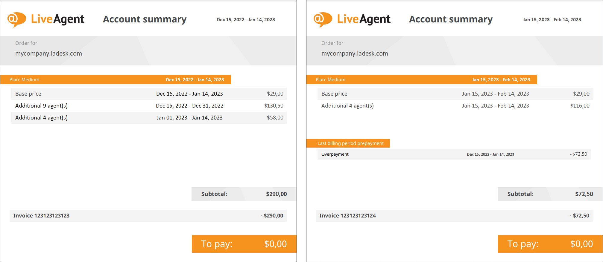 既存のエージェントの削除、プランに含まれていない有料アドオンの削除、または下位プランへのダウングレードを行うと、システムはLiveAgentアカウントの使用料金を再計算します。月次使用料は前払い済みであるため、差額は返金されませんが、次回の支払い時に追加クレジットとして充当されます。