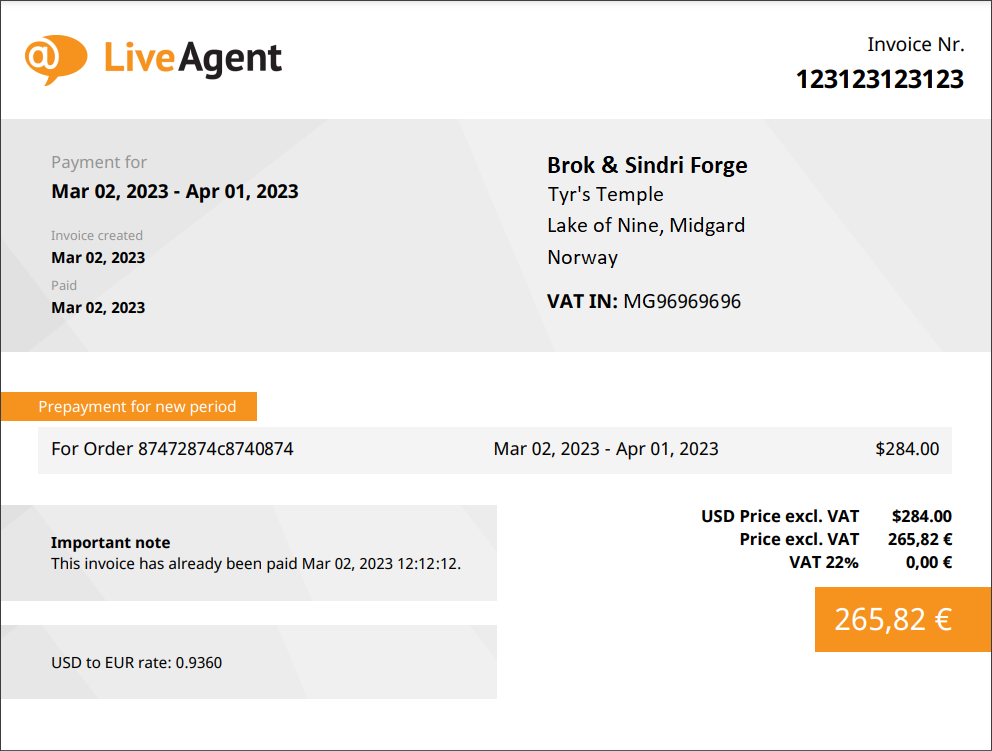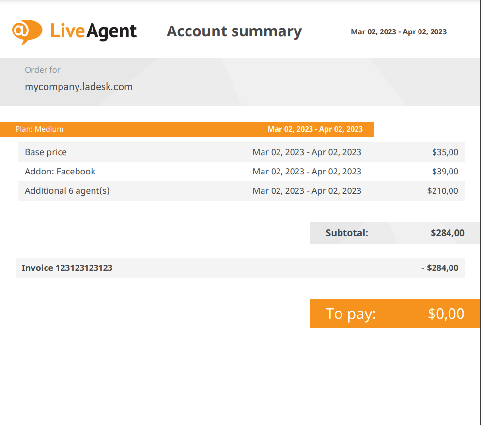現在の請求期間が終了すると、アカウントの使用状況サマリーのPDFファイルがLiveAgentアカウントの請求情報に設定されたメールアドレスに送信されます。現在の使用状況の内訳は、マイアカウントセクションでも確認できます。