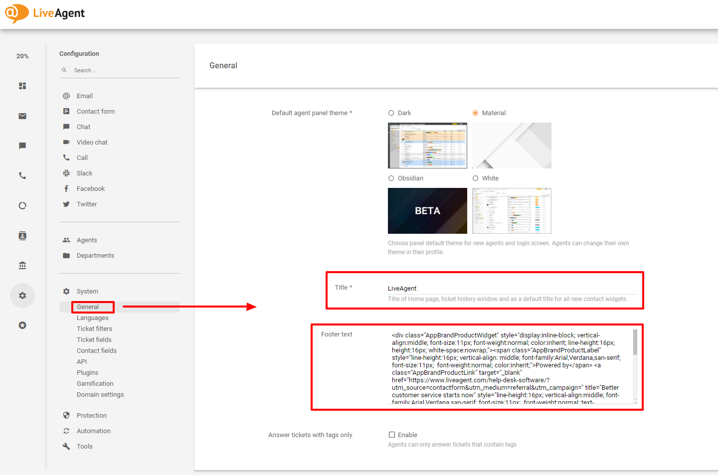 ページタイトルとデフォルトのフッターテキスト**“Powered by LiveAgent”を変更するには、同じウィンドウで少し下にスクロールしてください。“Branding Free”**(ブランディングフリー)機能を購入済みの場合、現在のフッターを編集したり、独自のHTMLフッターを貼り付けたりすることができます。