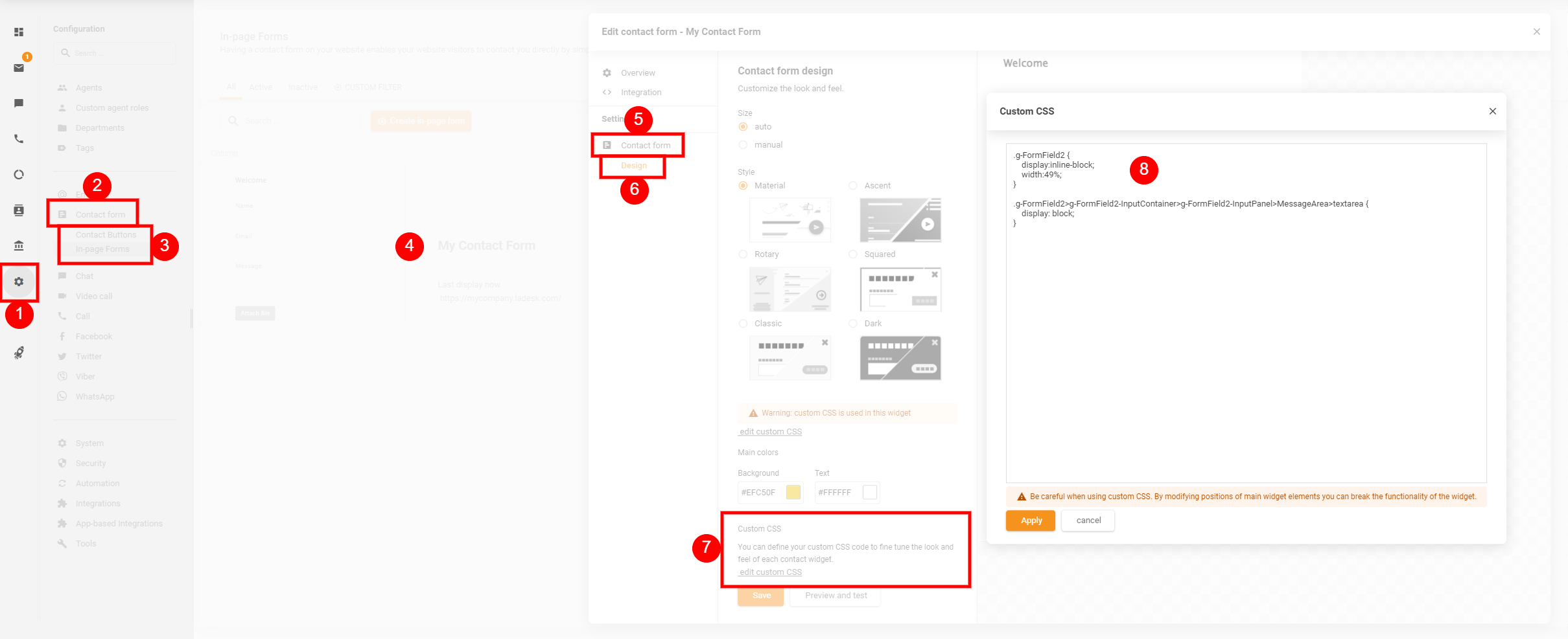 お問い合わせフォームからチケットを送信する際に、顧客から多くの情報を入力してもらう必要がある場合、すべてのフィールドが1列に並んだ長いフォームになってしまうことがあります。フィールドを複数列に分けることで、見た目をすっきりさせることができます。これを実現するには、お問い合わせフォームを編集し、設定内の Contact Form(お問い合わせフォーム)> Design(デザイン)> 最下部にある “edit custom CSS”(カスタムCSSを編集)に移動して、以下のCSSを追加します。