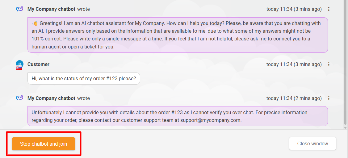 サポートエージェントは、チャット概要セクションの"View"(目のアイコン)ボタンを使って、選択したチャットボットの会話チケットにアクセスできます。チケットを開いた後、エージェントは「Stop chatbot and join」(チャットボットを停止して参加)ボタンをクリックできます。チャットに参加すると、会話は人間エージェントとの通常のチャットとして続きます。