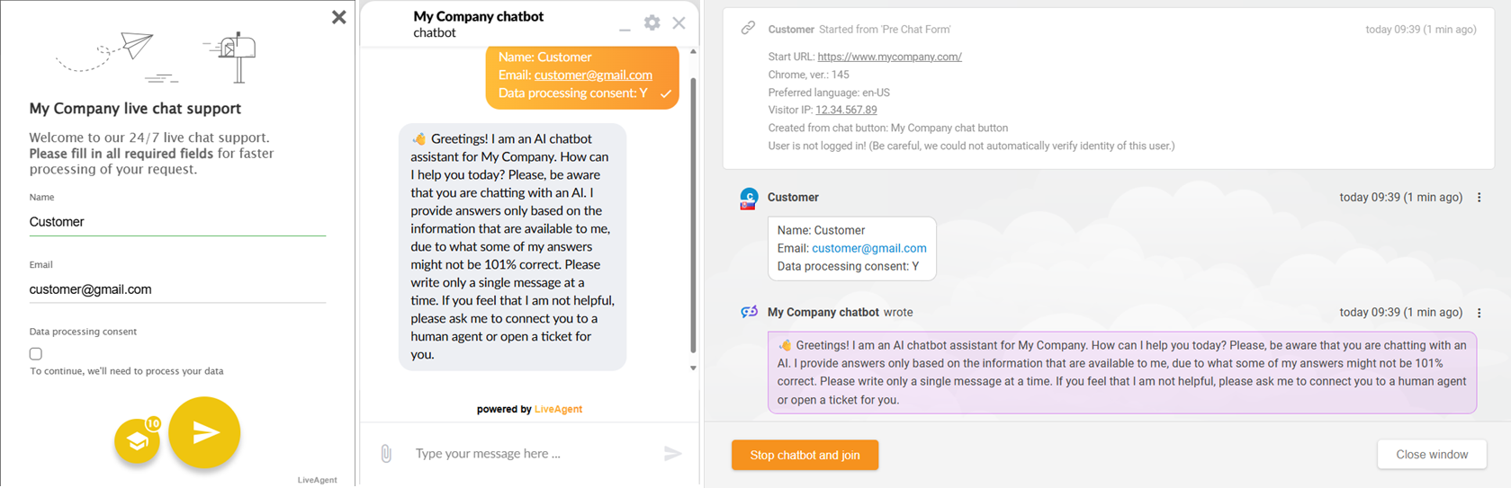 AIチャットボットとのチャットは、通常のチャットボタン**から開始でき、人間とのチャットとほぼ同じように動作します。**新たに特別なウィジェットを作成する必要はありません。チャットボタンにチャット前フォームで情報入力を求める設定がされている場合、AIチャットボットとのチャットが始まる前にそのフォームが表示されます。チャットボットとのチャットが開始されると、LiveAgent内に新しいチケットが作成されます。