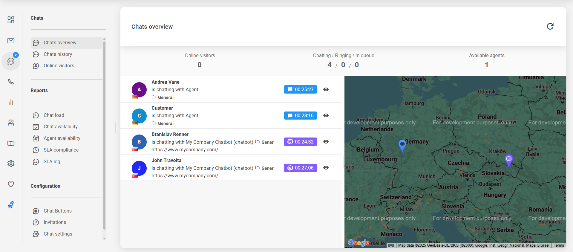 エージェントはチャット概要セクションでチャットボットとのアクティブなやり取りを確認し、“View”(目のアイコン)ボタンをクリックして内容を閲覧できます。チャットボットのチャットは視覚的に区別して表示され、チャット時間に関わらず人間エージェントとのすべてのチャットの下に一覧表示されます。