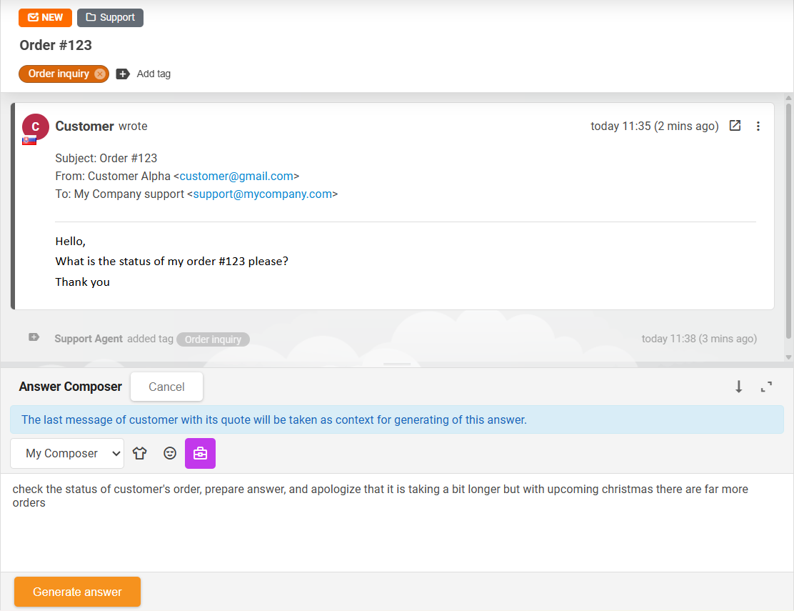 Answer Composer機能は、ボタン一つで洗練されたコンテキストを考慮した返信を作成できるようにすることで、サポートのワークフローを変革します。チケットのメッセージを分析し、適切なコンテキストとトーンを捉えた下書き応答を即座に生成します。エージェントはスタイル(カジュアル、ニュートラル、ビジネス)を調整したり、カスタム指示を追加したりすることで、各メッセージを細かく調整できます。数秒のうちに、完成度の高いプロフェッショナルな下書きが生成され、そのまま送信するか、さらに編集して最適な返信に仕上げることができます。