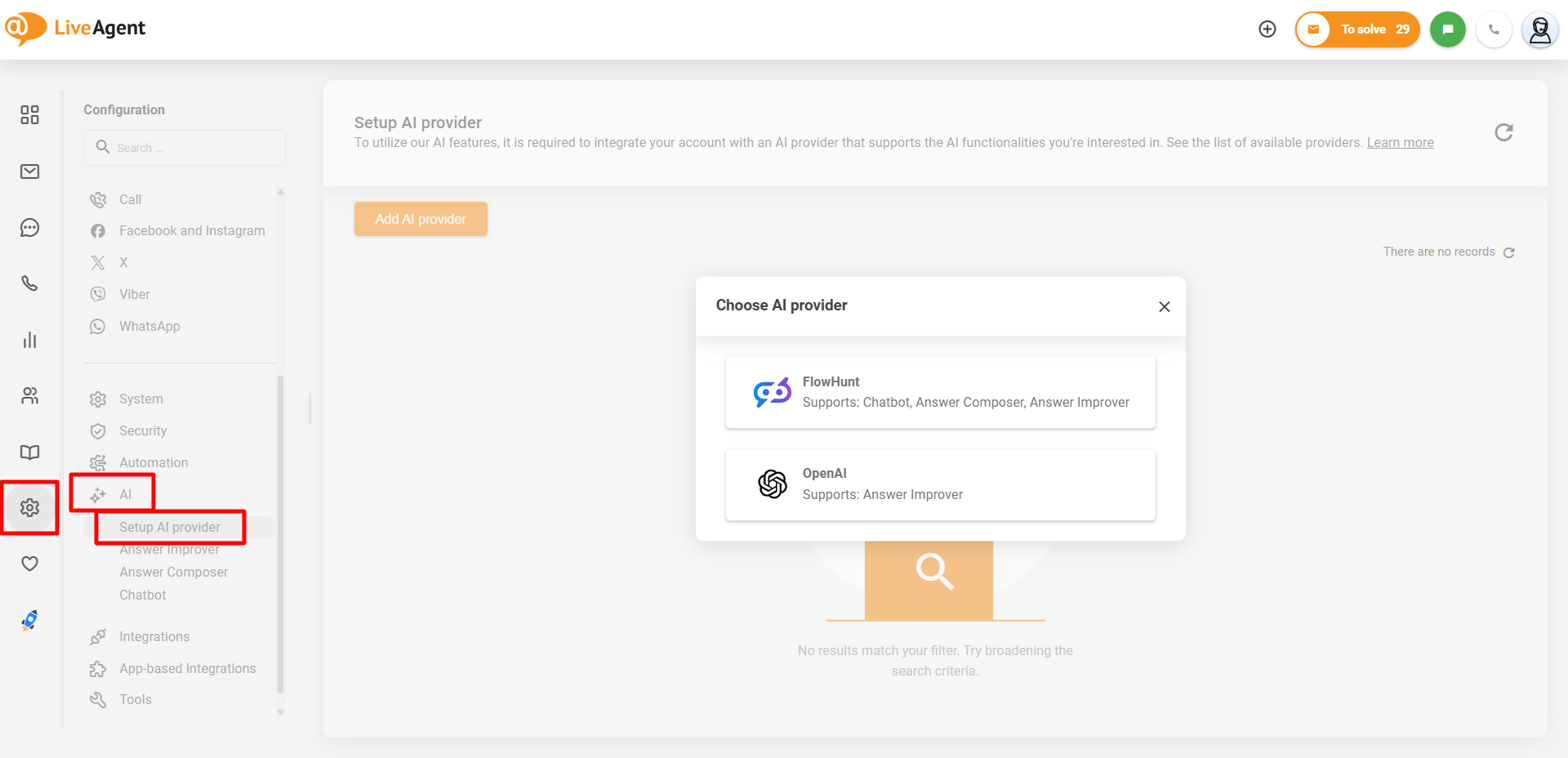 OpenAI APIキーを生成したら、LiveAgentパネルで Configuration > AI > Setup AI provider に移動し、「Add AI provider」ボタンをクリックして「OpenAI」を選択します。