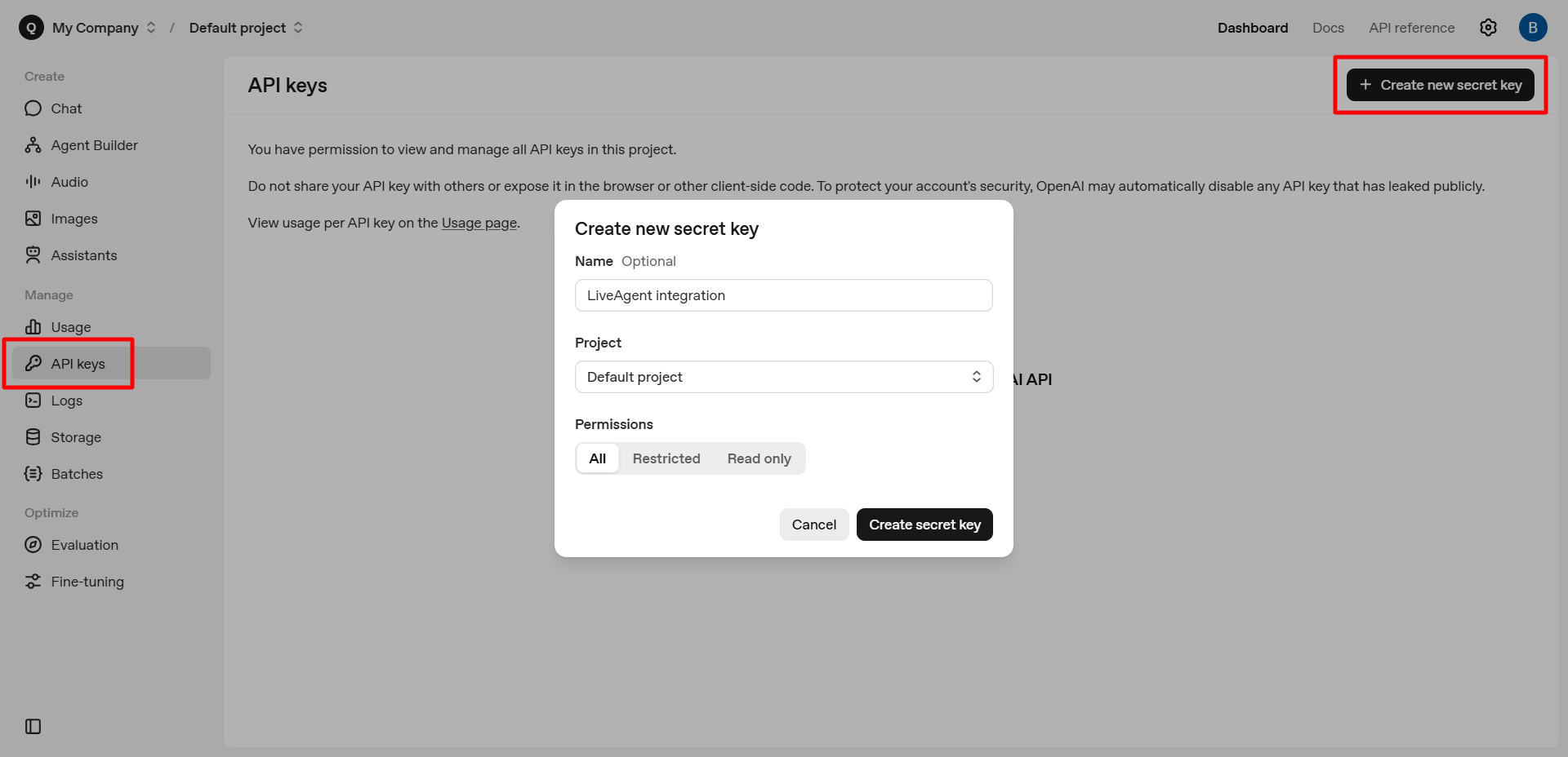 LiveAgentアカウントをOpenAIと連携するには、OpenAIダッシュボードの API keys セクションに移動し、「Create new secret key」ボタンをクリックします。 新しいAPIキーに名前を付け、プロジェクトを選択して、「Create secret key」ボタンをクリックします。新しいキーが作成されると、画面に表示されます。
