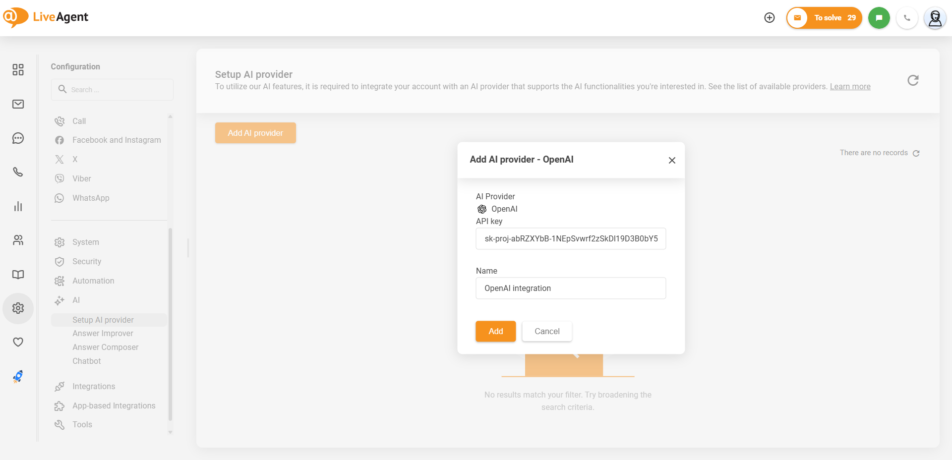 表示されたフィールドにOpenAI APIキーを入力し、他の設定で識別しやすいよう統合に名前を付けて、「Add」をクリックして設定を保存します。これでOpenAIアカウントがLiveAgentと連携され、Answer Improver機能を有効化して使用できるようになります。