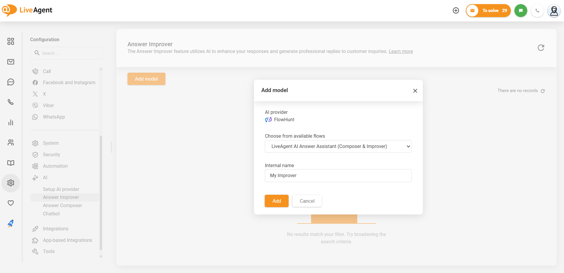 Answer Improver機能を使用するには、LiveAgentアカウントをFlowHuntまたはOpenAIと連携させる必要があります。