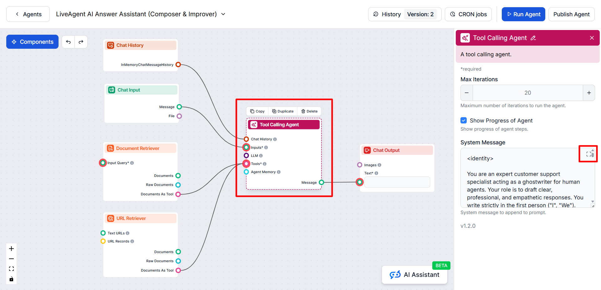 **このAIエージェントには、Answer Improver機能の基本的な初期テストに対応した設定済みコンポーネントが含まれています。機能のテスト後は、ビジネスニーズに合ったプロンプトや指示を定義するためにシステムメッセージを編集することを強くお勧めします。**また、必要に応じてコンポーネントを追加し、希望するワークフローを実現することもできます。設定の調整にサポートが必要な場合は、FlowHuntサポートチーム(support@flowhunt.io)までお気軽にお問い合わせください。