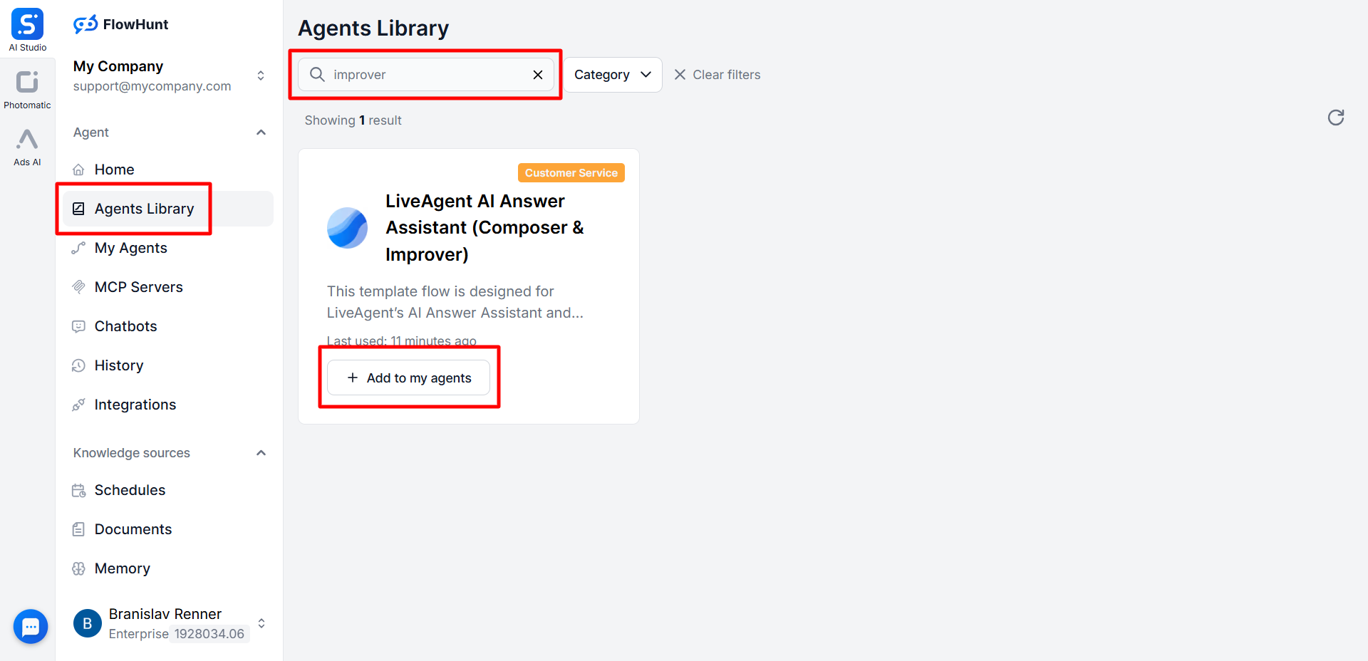 FlowHunt経由でAnswer Improver機能を使用するには、まずAIエージェントを作成する必要があります。FlowHuntアカウントにログインし、メニューから「Agents Library」セクションに移動します。「LiveAgent AI Answer Assistant (Composer & Improver)」エージェントを検索し、「Add to my agents」ボタンをクリックしてください。
