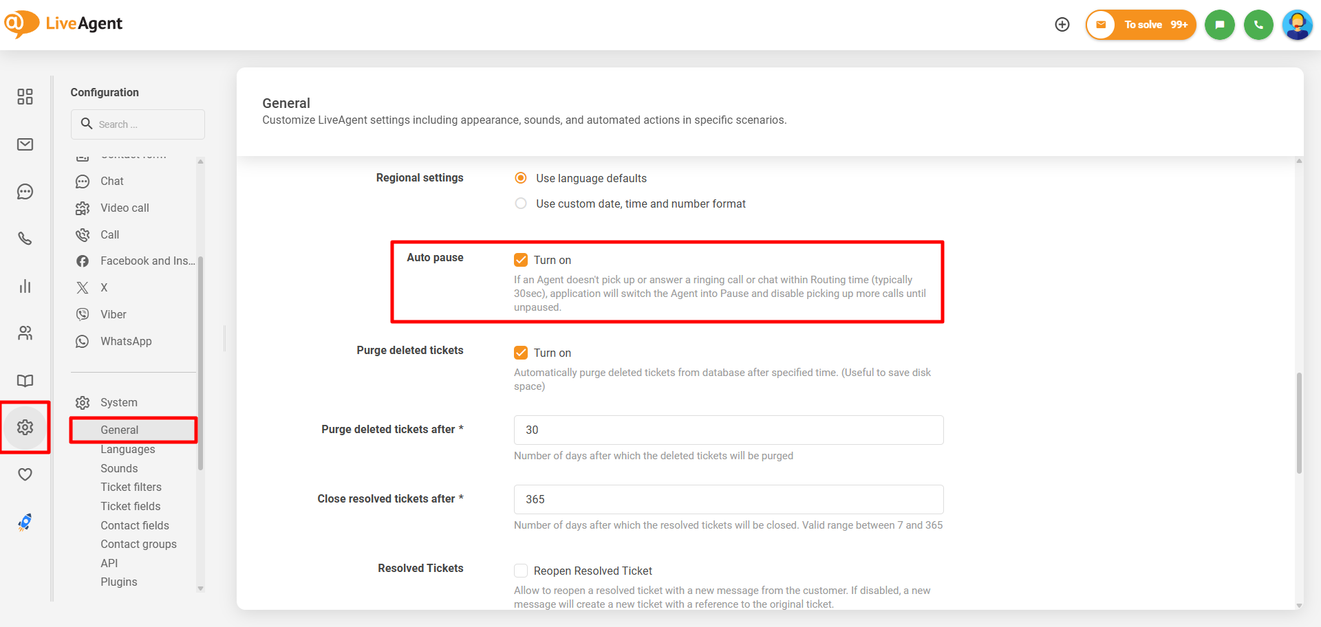 自動ポーズを有効にするには、オーナーまたは管理者としてログインし、Configuration > System > General(設定 > システム > 一般)へ移動します。「Auto pause」(自動ポーズ)オプションにチェックを入れ、Save(保存)をクリックします。