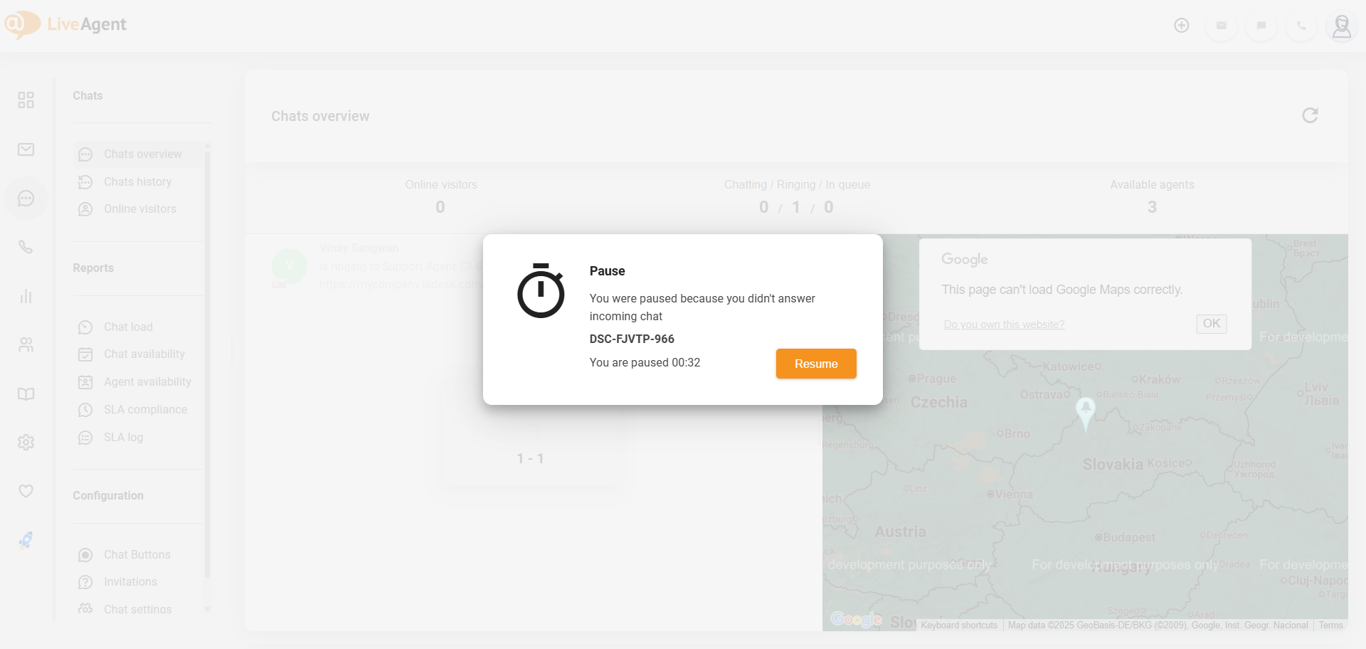 エージェントが自動ポーズされると、手動でポーズした場合と同様の画面が表示されます。ポーズされている時間を示すタイマーと、ポーズのきっかけとなったチャットまたは通話のチケットIDが表示されます。チケットIDをクリックすると、ポーズが解除され、ポーズのきっかけとなったチケットが開きます。