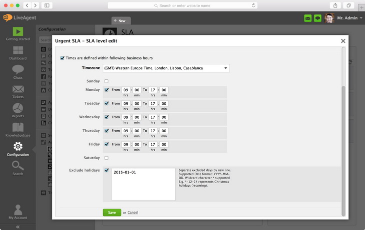 LiveAgentのビジネスアワーを設定することで、SLAレベルを指定した時間帯のみ機能させることができ、祝日を除外するオプションも利用可能です。