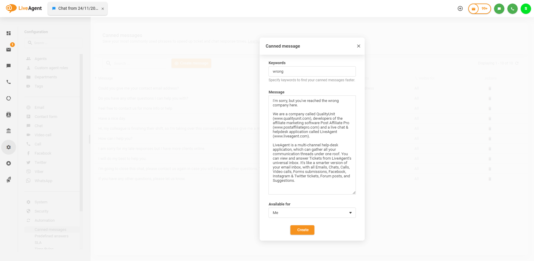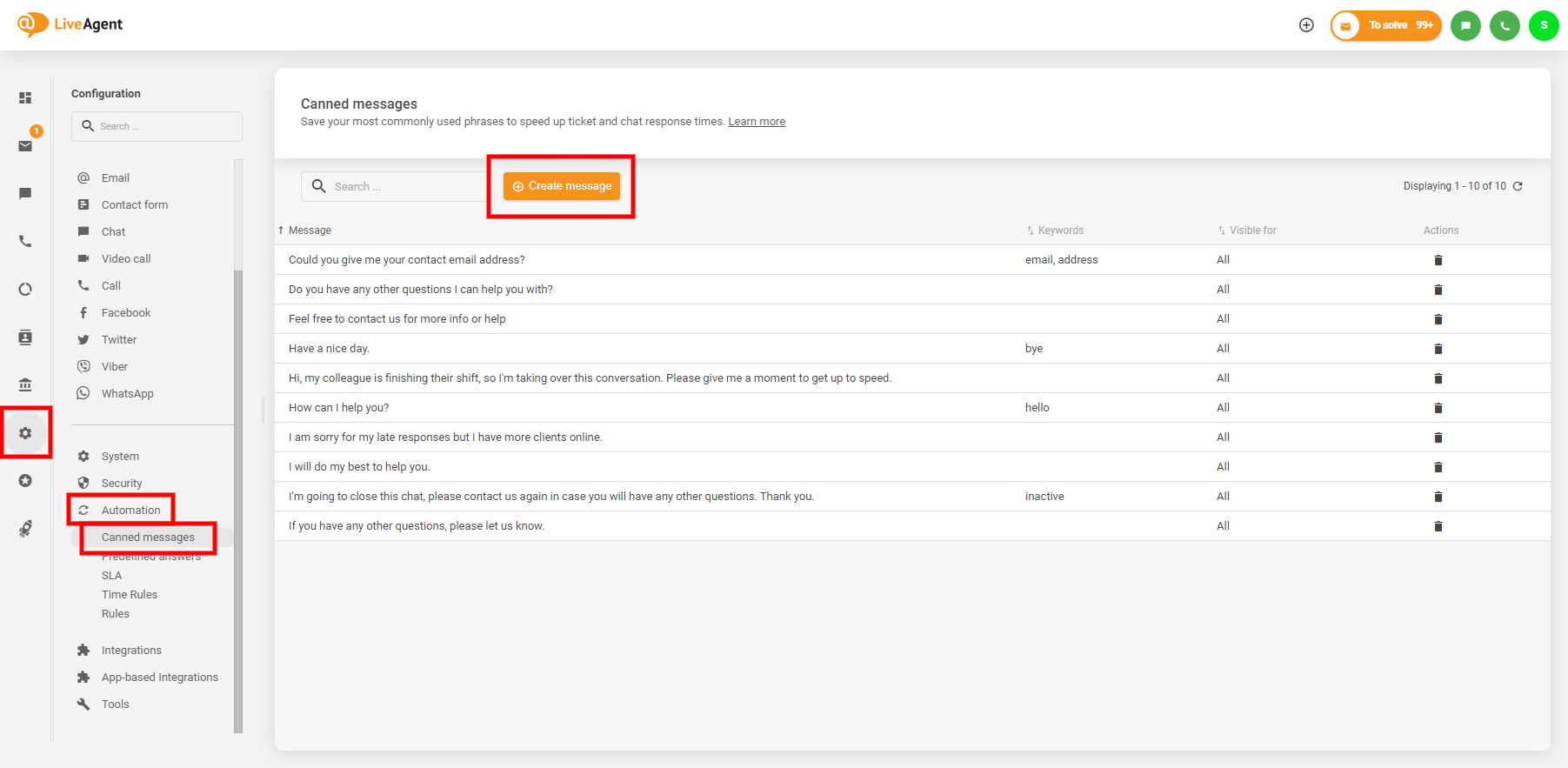 新しい定型文を作成するには、Configuration(設定)> Automation(自動化)> Canned messages(定型文)に移動し、"+ Create message"(メッセージを作成)ボタンをクリックします。