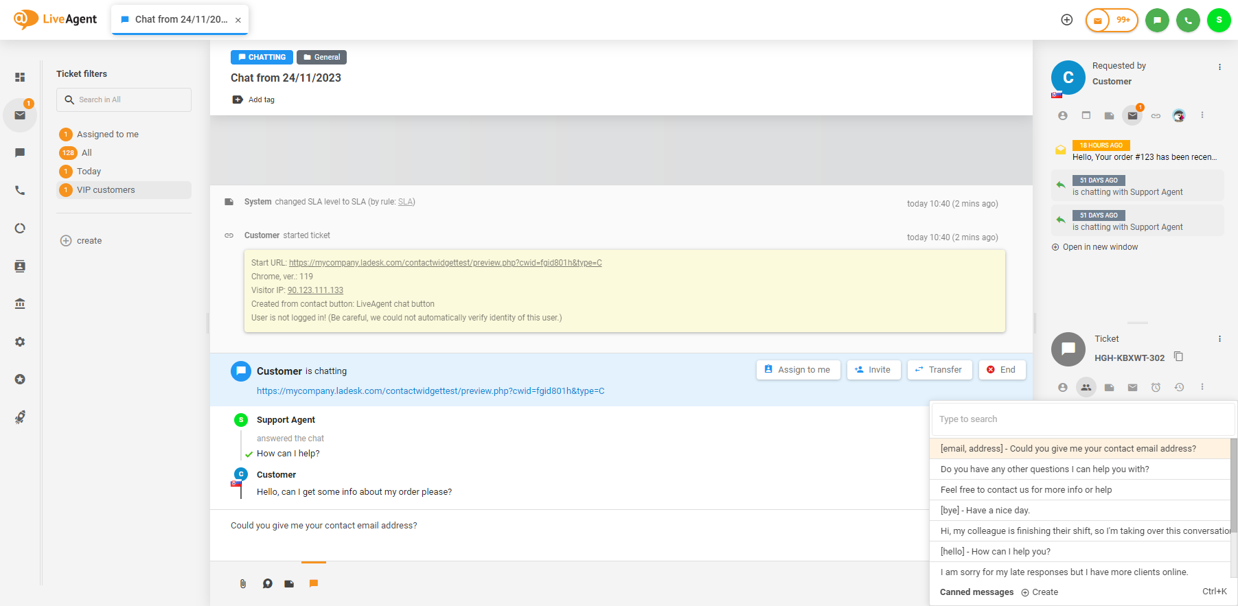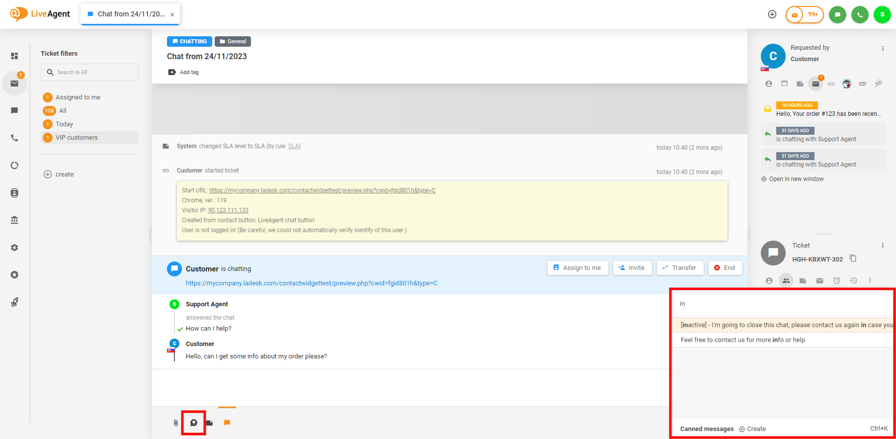 チケットの返信やチャットメッセージに定型文を追加するには、“Canned message”(定型文)ボタン(チャットバブルに電球のアイコン)をクリックするか、Windows/Linuxではショートカットの Control + Space または Control + K、Macでは ⌘ Command + K を使用します。