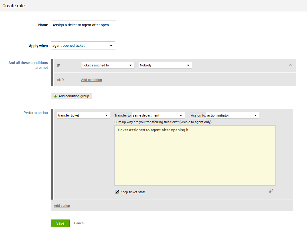 「agent opened ticket」ルールプロファイルを使用し、このルールによって自動割り当てが行われるために、チケットが誰にも割り当てられていないという条件を追加します。