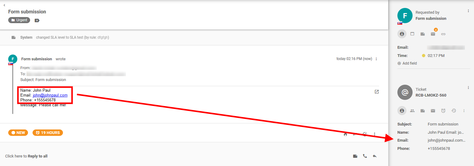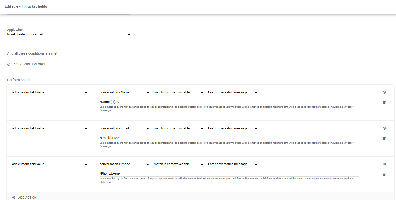 このルールは最後のメッセージを検索し、Name: と改行の間にあるすべての内容をチケットのNameフィールドに保存します。同様に、メールアドレスや電話番号も解析して取得します。