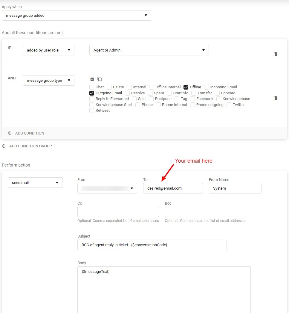 エージェントや管理者からお客様へ送信されたすべてのメールを、外部のメールアドレスに転送(BCC)することがLiveAgentで可能かどうか、というご質問をいくつかのお客様からいただいています。LiveAgentにはそのための直接的な設定オプションはありませんが、ルールを設定することで実現できます。Configuration(設定)→ Automation(自動化)→ Rules(ルール)に移動し、以下のスクリーンショットのように新しいルールを作成してください。