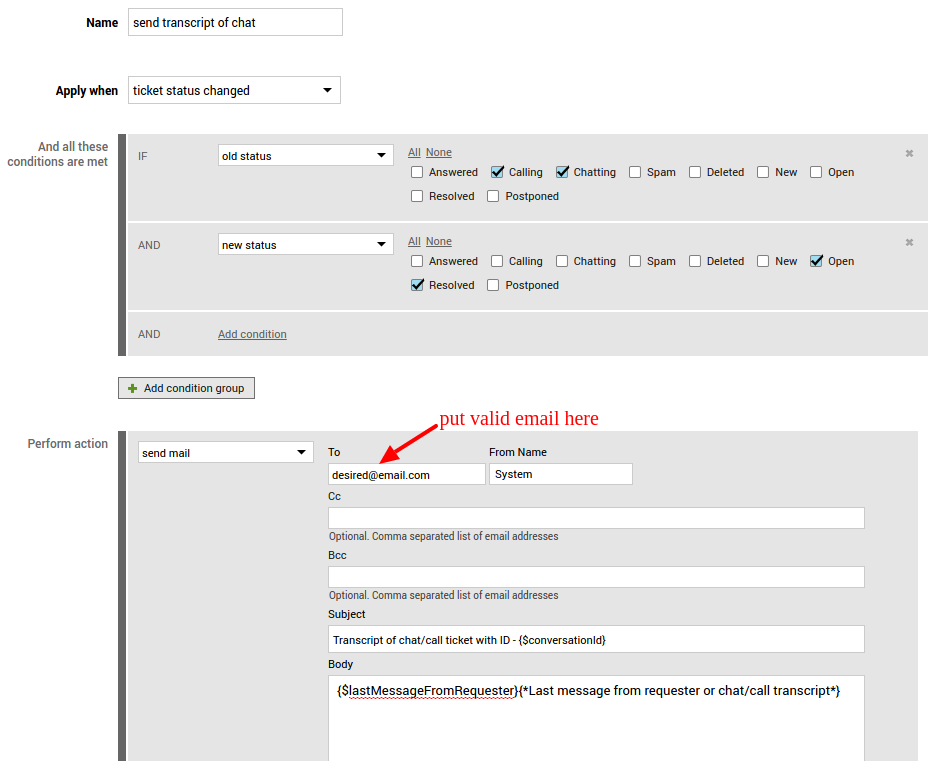 必要なのは、チャット/通話が終了した後に指定のメールアドレスへメールを送信するルールを作成し、メールのテンプレートに {$lastMessageFromRequester}{*Last message from requester or chat/call transcript*} 変数を使用することだけです。
