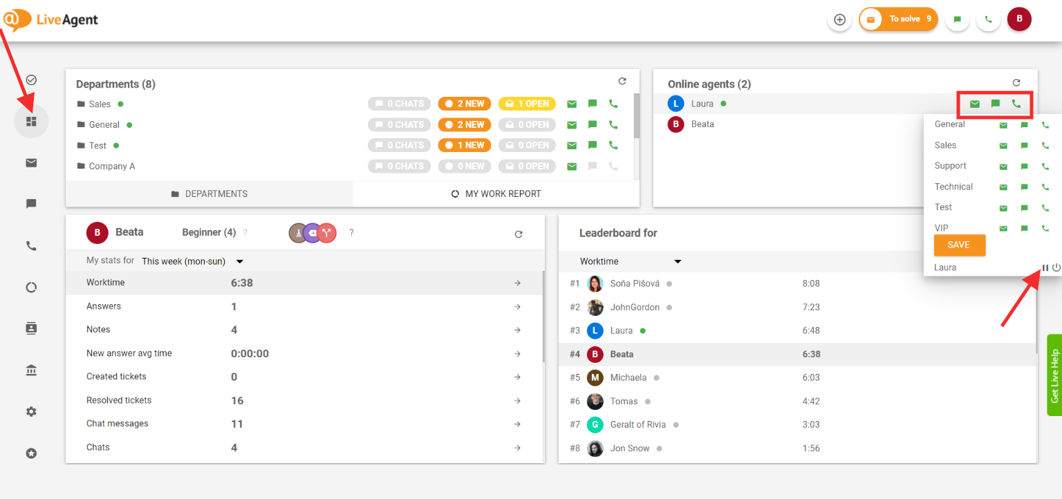 LiveAgentでは、エージェントと管理者がポーズ(一時停止)状態に移行するオプションを提供しています。これは主に、外出中やコンピューターから少し離れる際(昼食やコーヒーブレイクなど)に、チケット・チャット・通話の受信を停止するために使用されます。