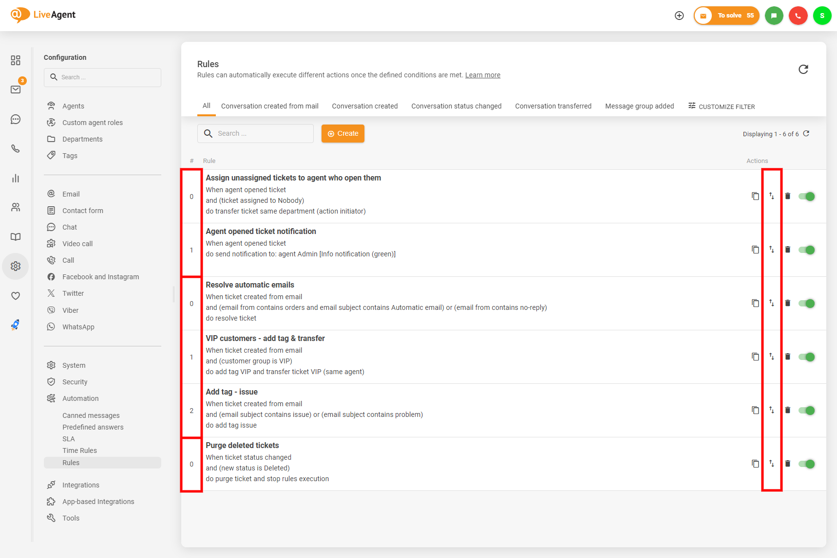 LiveAgentでは、ルールはトリガーに基づいて事前に定義された順序で実行されます。実行順序は「# Order」(順番)列に表示されています。同じトリガーを持つルールはリスト上でトリガーグループとしてまとめられています。新しく追加されたルールはリストの末尾に追加されますが、これはトリガーグループ内に限られます。ルールをトリガーするアクションはそれぞれ異なり、異なるタイミングで発生する場合があるためです。各トリガーグループは独自の順序を持ち、グループ内のルールの順序は「Actions」(アクション)列の「Change order」(順序を変更)ボタンをクリックすることで変更できます。