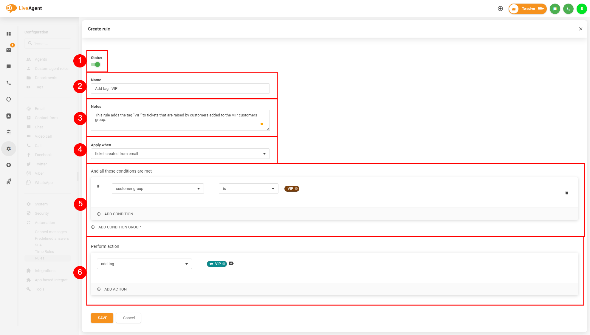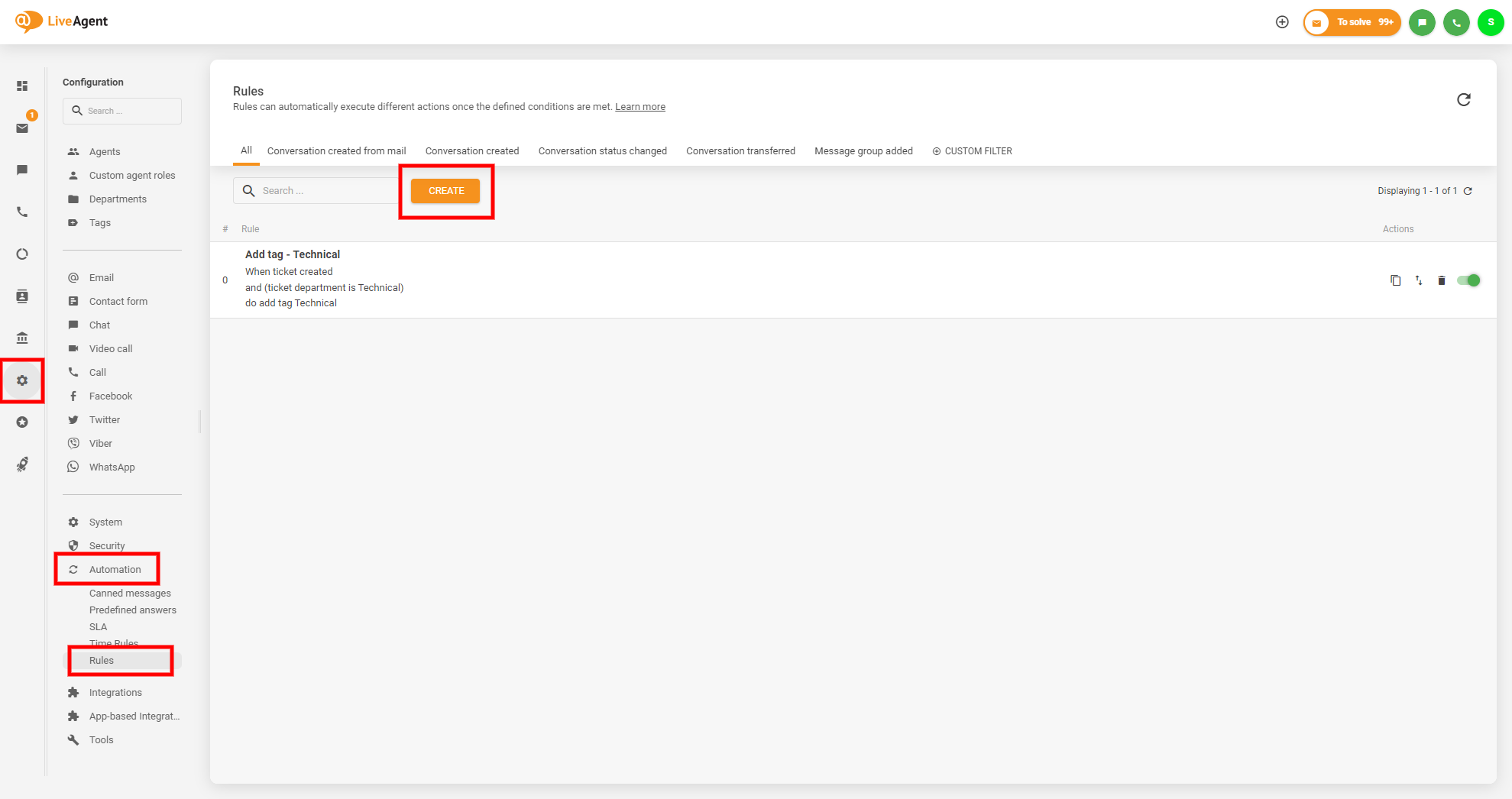 新しい自動化ルールを作成するには、LiveAgentパネルで「Configuration」(設定)> 「Automation」(自動化)> 「Rules」(ルール)に移動し、「Create」(作成)ボタンをクリックします。