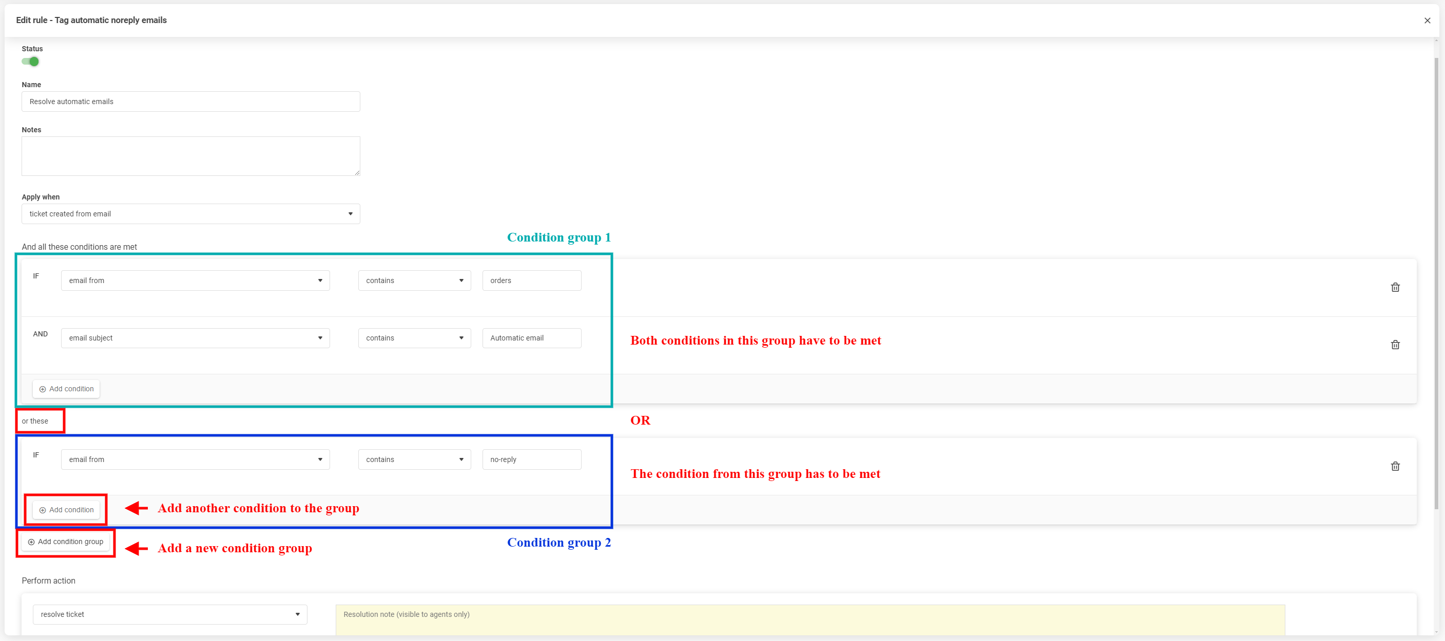 - Rule conditions and condition groups(ルールの条件と条件グループ)(任意) - ルールを実行するために満たす必要がある追加条件です。条件は条件グループ内に追加され、グループ内のすべての条件が満たされる必要があります。一方、複数のグループが定義されている場合は、いずれか1つの条件グループが満たされればルールが実行されます。