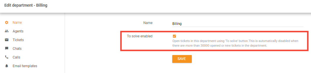 特定の部門のチケットを除外し、To solve ボタンから開かれないようにしたい場合は、Configuration(設定)→ Departments(部門)→ To solve enabled のチェックを外す で設定できます。この設定を行うと、その部門のチケットはチケット受信トレイからのみ直接回答できるようになります。エージェントが To solve ボタンにその特定の部門を含めていても、To solve ボタンからは開かれません。