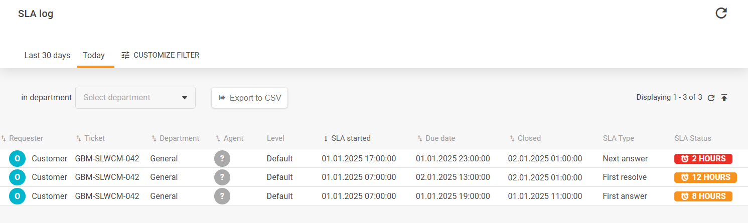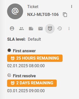 | チケット作成 1.1. 07:00 | 初回回答 | 1.1. 07:00 | 2.1. 08:00 | - | 残り25時間 |