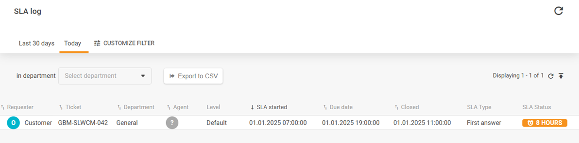 4時間後の11:00にチケットに返信すると、初回回答SLAのレコードが完了・終了し、SLAログに期日1.1. 19:00・終了日時1.1. 11:00として記録されます。SLAステータス時間は残り8時間となります(初回回答SLAに与えられた12時間から、チケットが新規ステータスだった4時間を差し引いた値)。