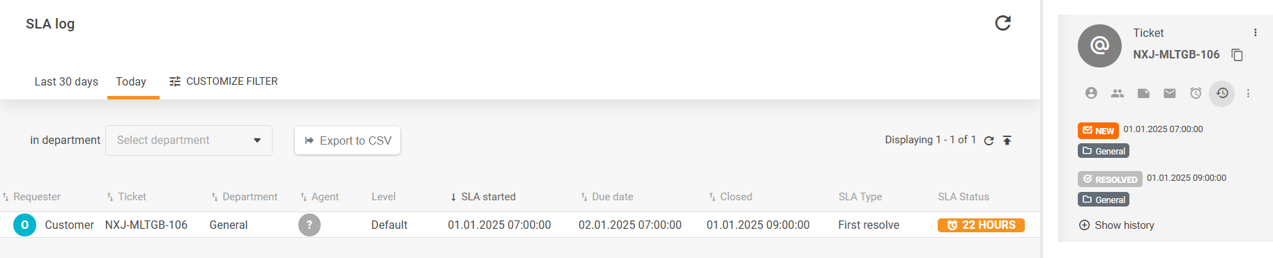 新しいチケットが1.1.の7:00に作成されます。この時点で、初回回答SLAの期日は1.1. 19:00に、初回解決SLAの期日は2.1. 7:00に設定されます。2時間後の9:00にチケットを解決すると、チケットが新規ステータスのまま回答されなかったため、初回回答SLAは未達成となり、そのレコードはSLAログに表示されません。初回解決SLAのレコードは終了し、SLAログに期日2.1. 7:00・終了日時1.1. 9:00として記録され、SLAステータス時間は残り22時間となります。