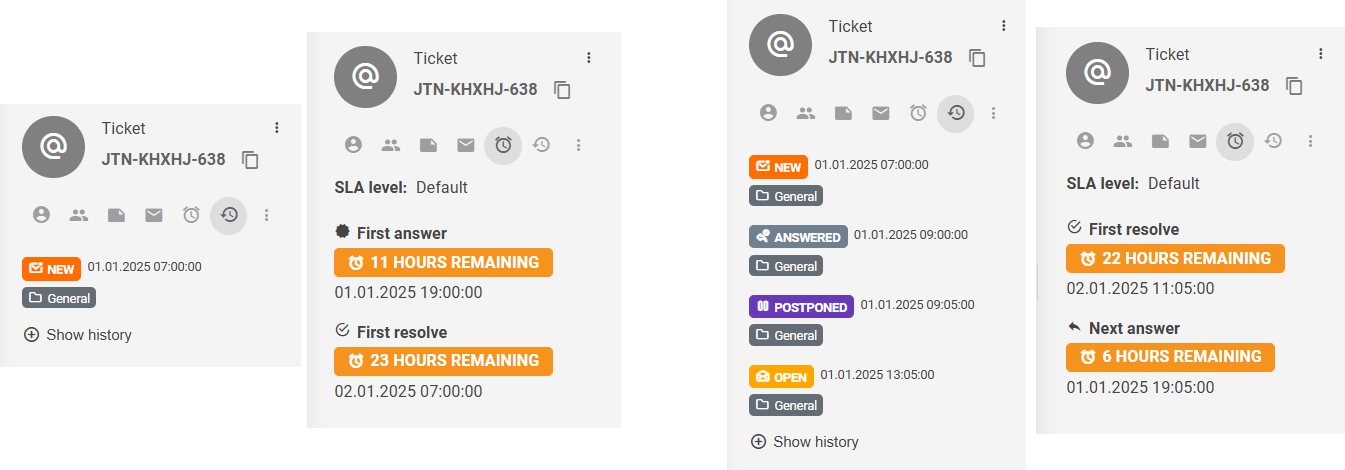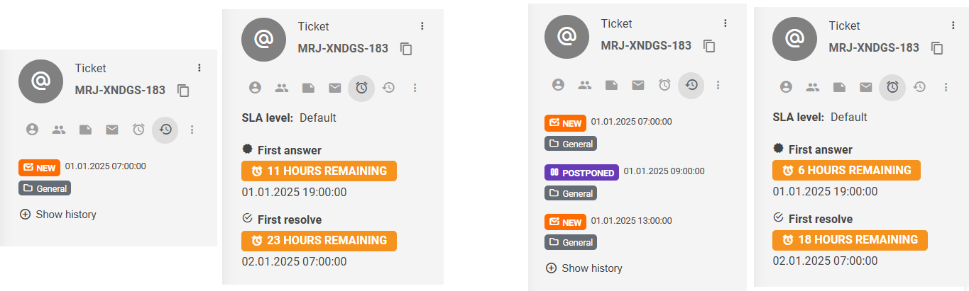 新しいチケットが1.1.の7:00に作成されます。この時点で、初回回答SLAの期日は1.1. 19:00に、初回解決SLAの期日は2.1. 7:00に設定されます。2時間後の9:00にチケットを4時間延期しても、チケットが新規ステータスから延期されたため、SLA時間には影響しません。13:00にチケットが再開されると、初回回答SLAの期日は引き続き1.1. 19:00(残り6時間)のままで、初回解決SLAの期日も2.1. 7:00(残り18時間)のままです。