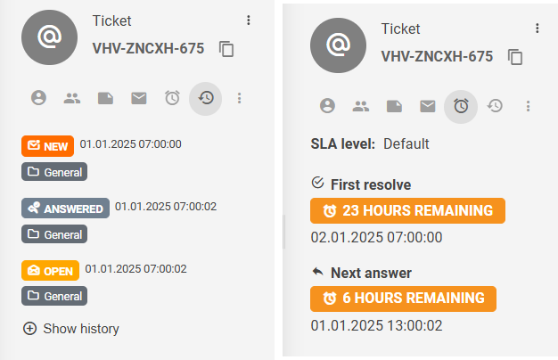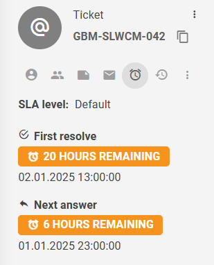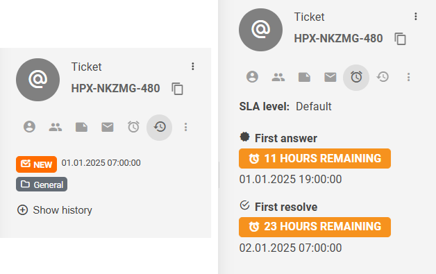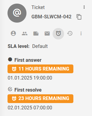 新しいチケットが1.1.の7:00に作成されます。この時点で、初回回答SLAの期日は1.1. 19:00に、初回解決SLAの期日は2.1. 7:00に設定されます。