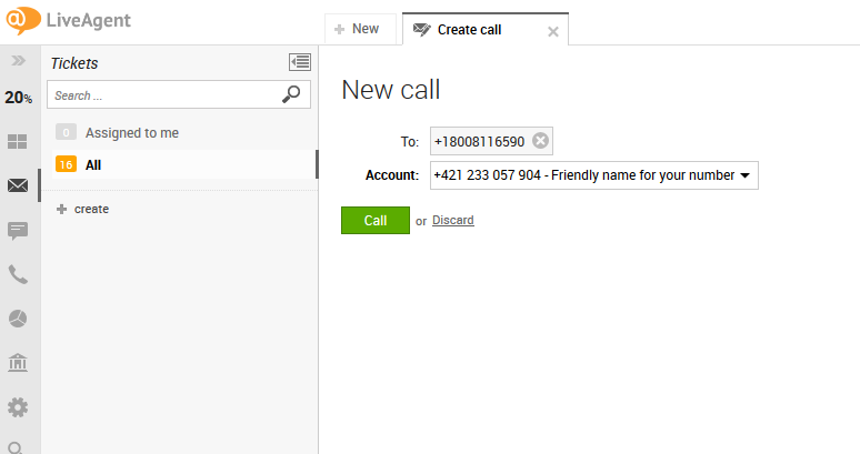 新しいチケットを通話と共に作成したい場合は、LiveAgentのエージェントパネル上部にある「New」(新規)->「New call」(新規通話)に進みます: