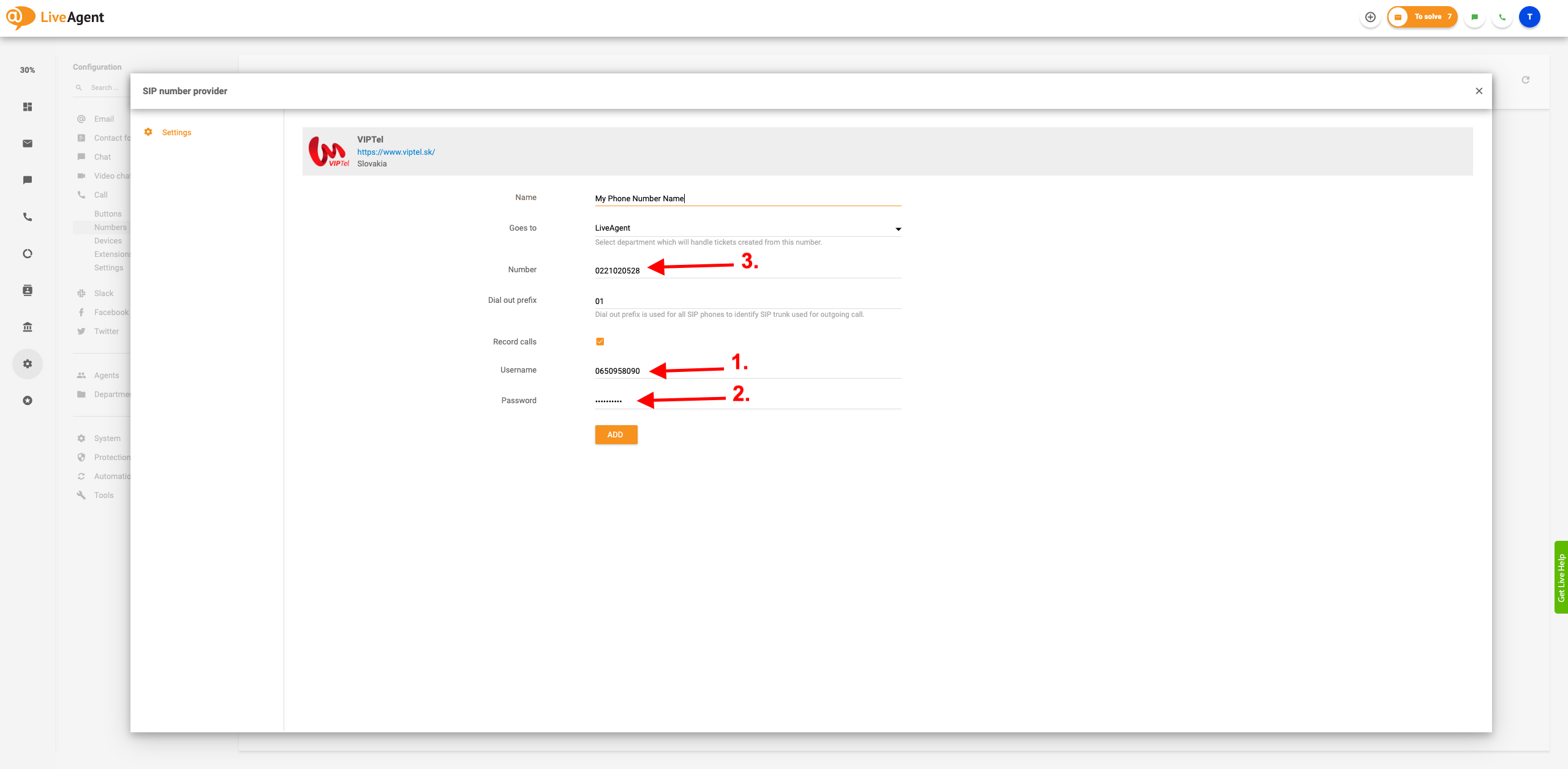 2. Live AgentにVIPTelのアカウント情報を入力する