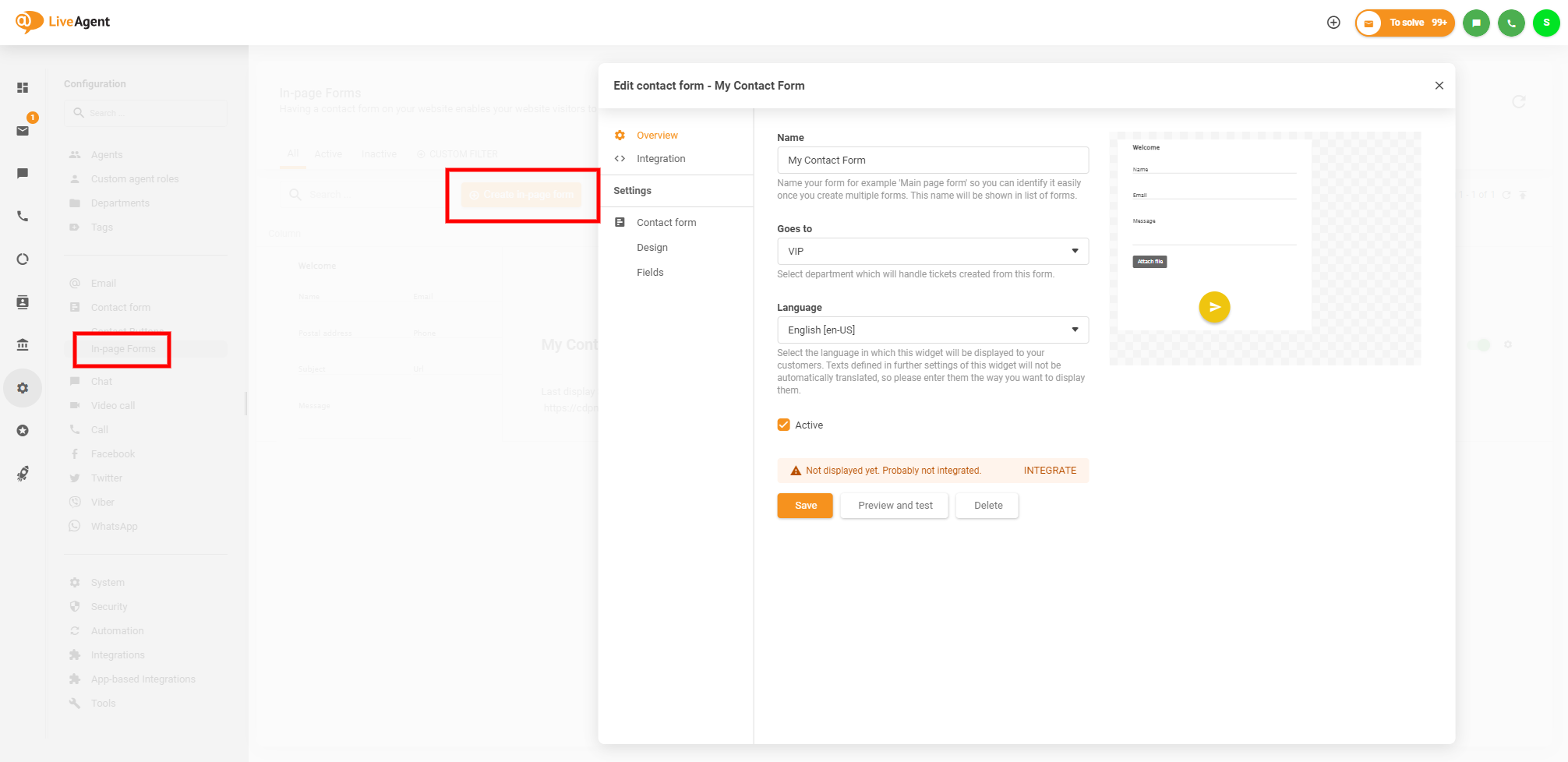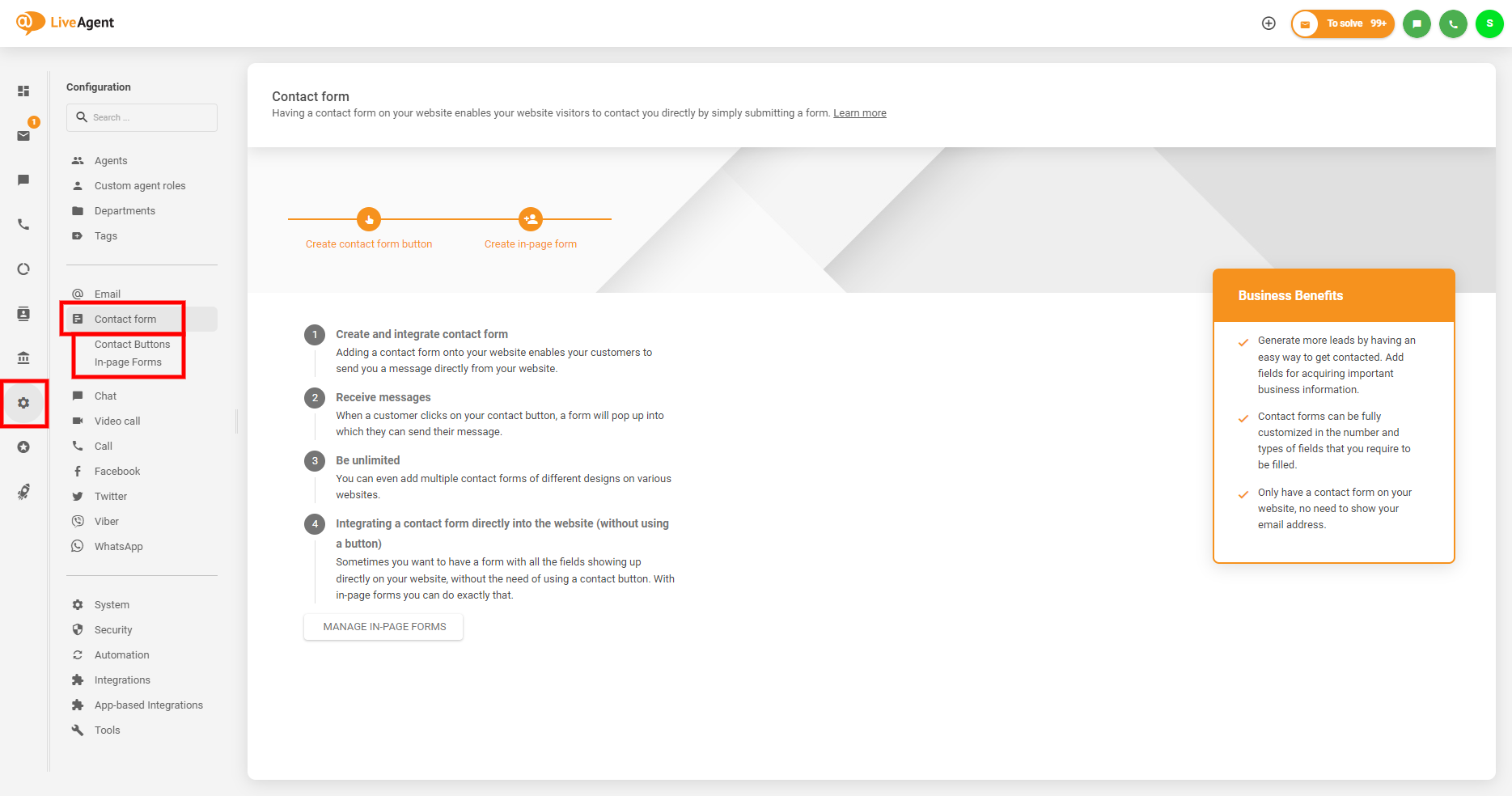 ページ内お問い合わせフォームを作成するには、Configuration(設定)> Contact form(お問い合わせフォーム)> In-page Forms(ページ内フォーム)に移動し、“Create in-page form”(ページ内フォームを作成)ボタンをクリックします。