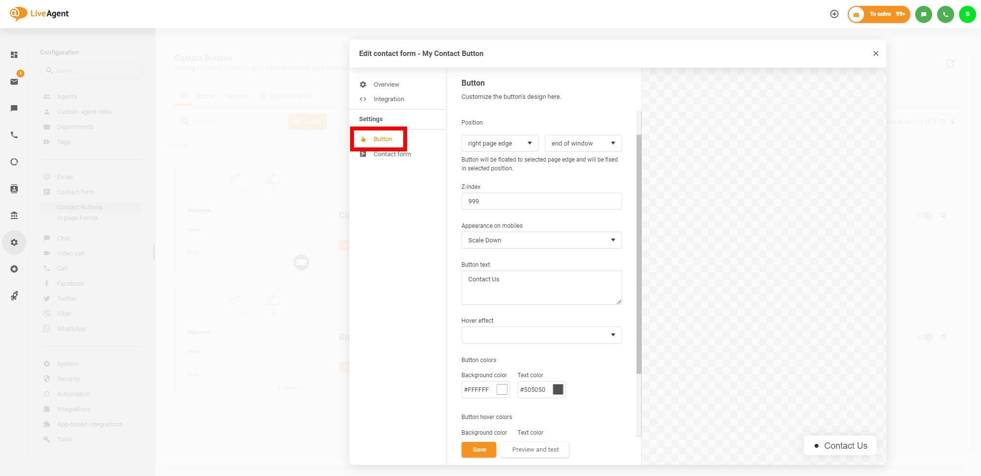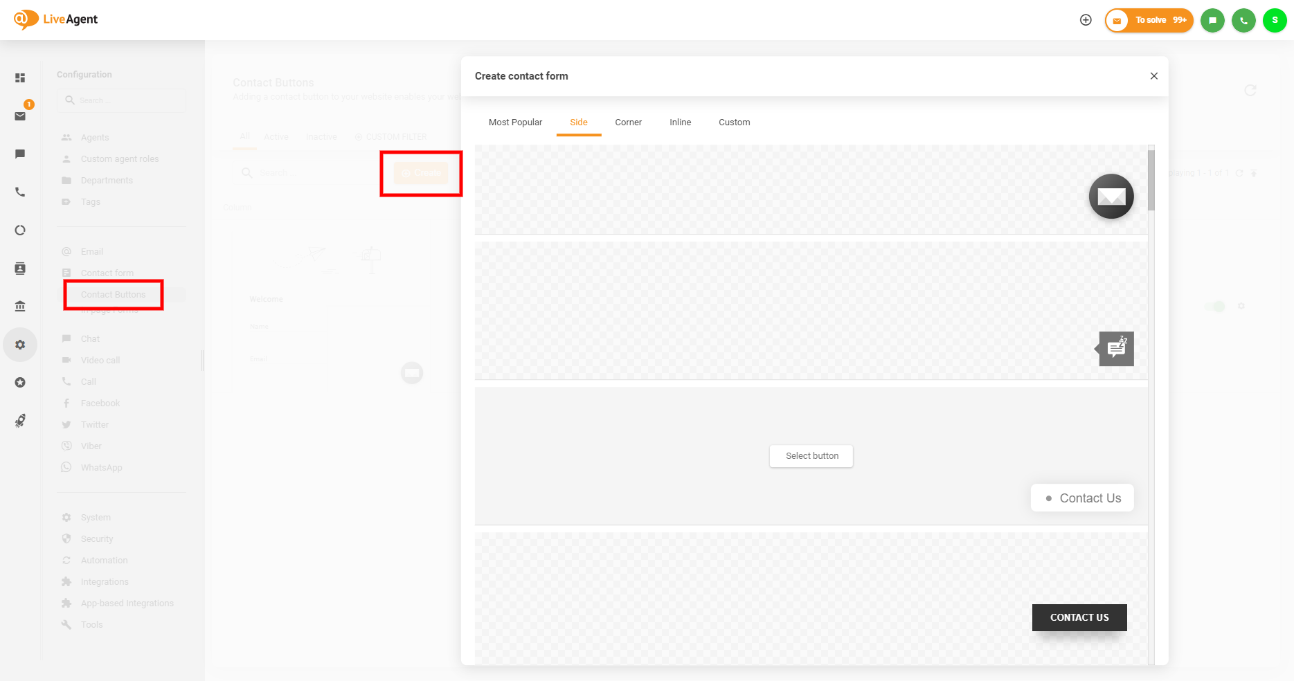 お問い合わせボタンを作成するには、Configuration(設定)> Contact form(お問い合わせフォーム)> Contact button(お問い合わせボタン)に移動し、“Create”(作成)ボタンをクリックして、お問い合わせボタンのスタイルを選択します。