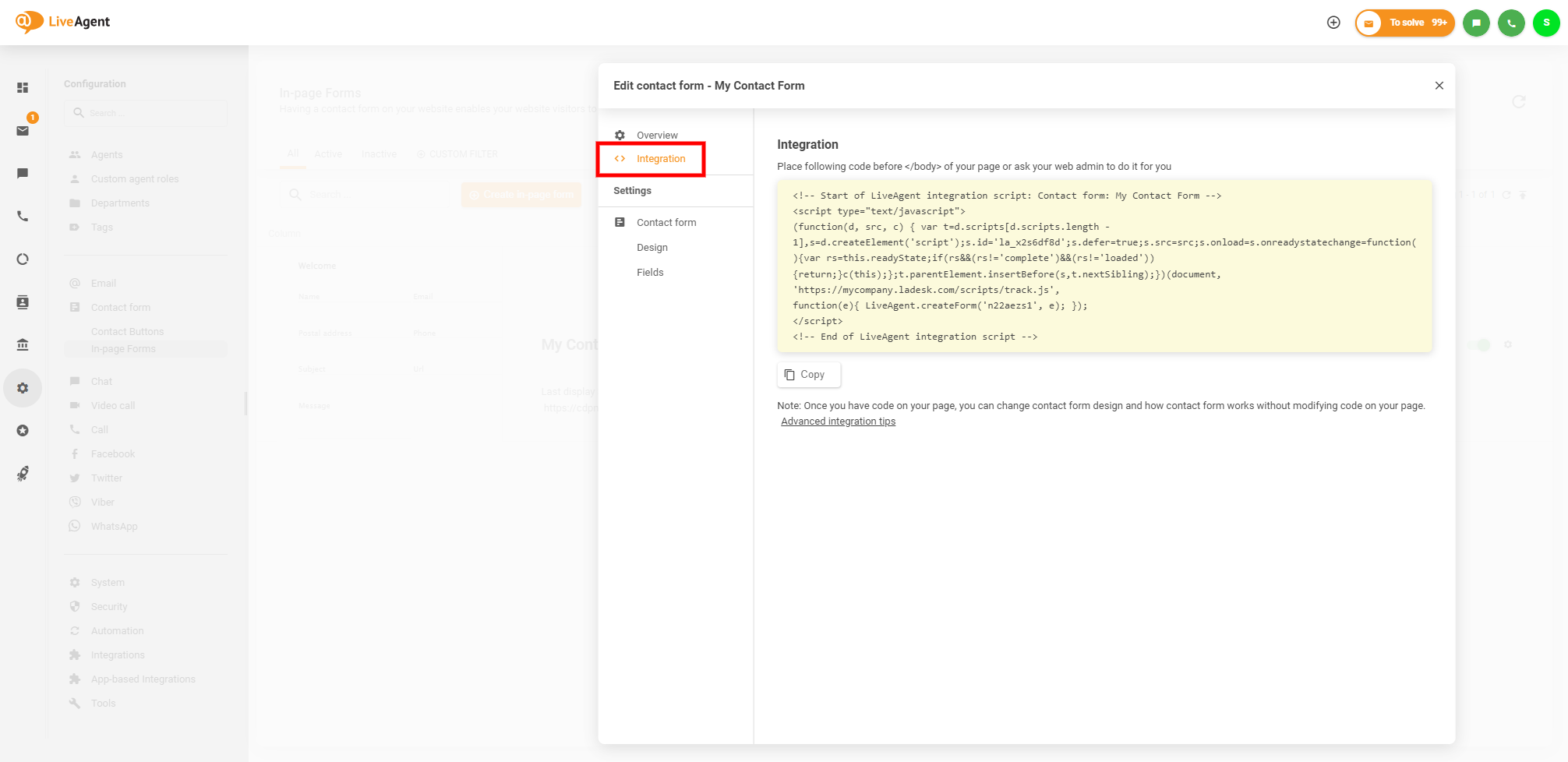 お問い合わせフォームをウェブサイトに設置するには、Integration(インテグレーション)セクションに移動し、インテグレーションスクリプトをコピーして、フォームを表示するページのbody内にコードを貼り付けてください。