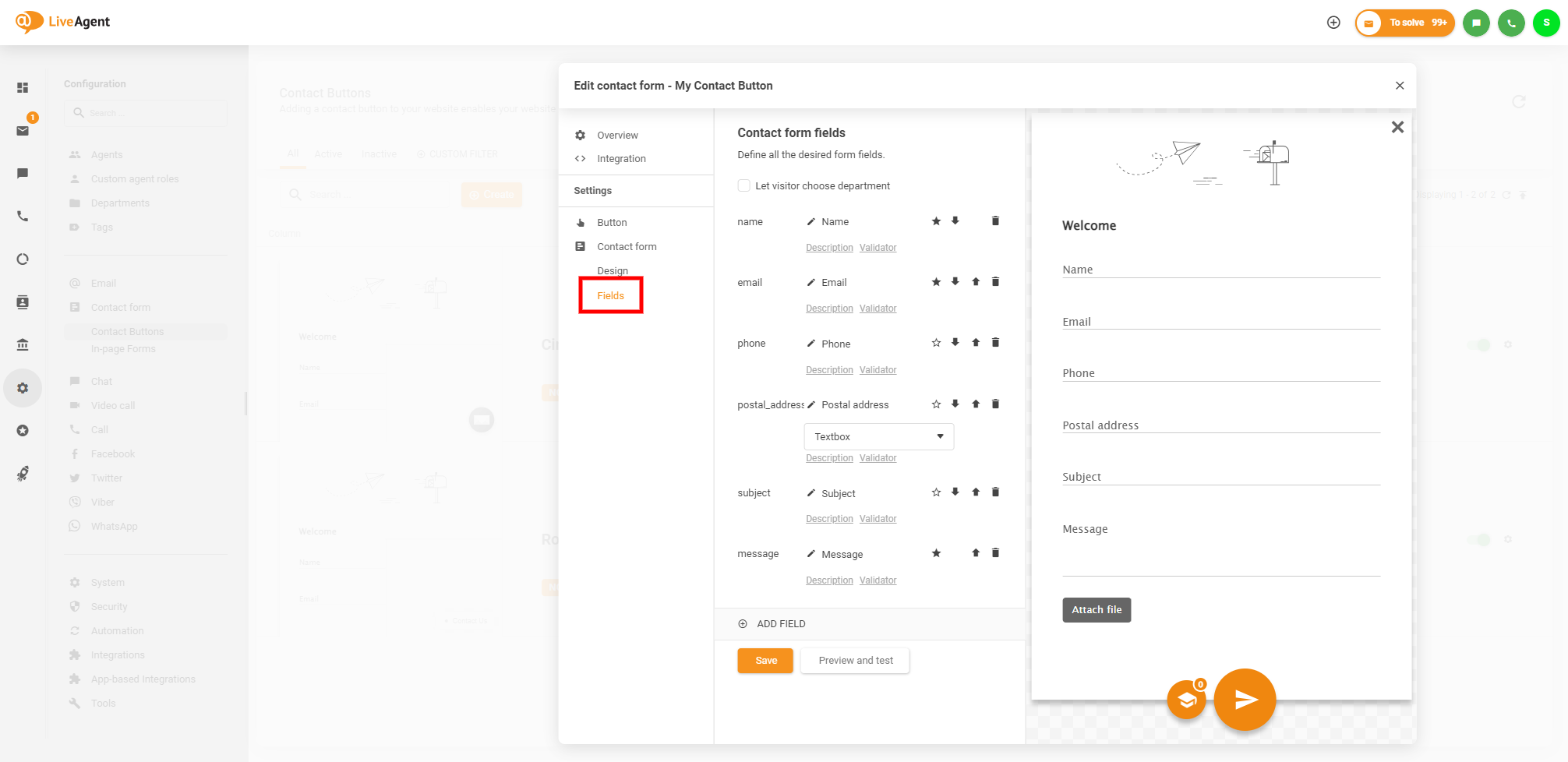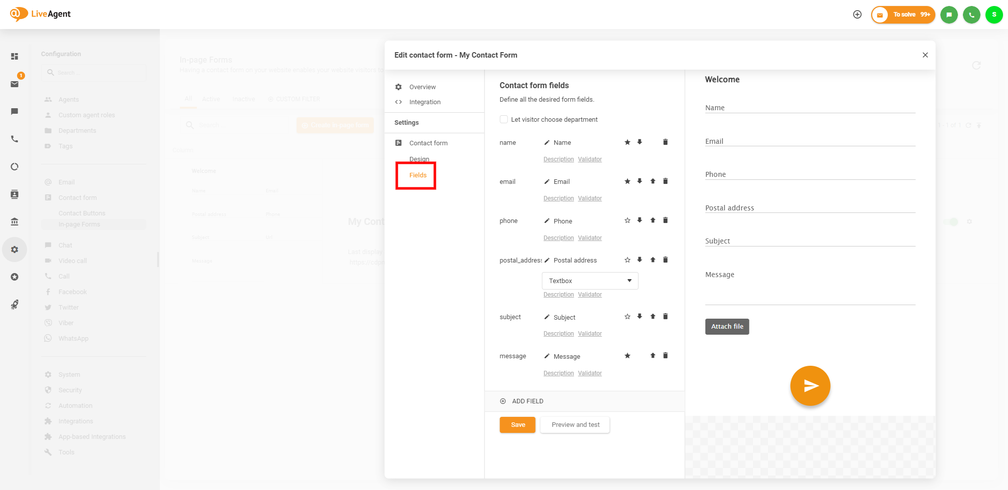 お問い合わせフォームにさらにフィールド(名前、メール、電話番号、注文ID、会社名、メッセージなど)を追加するには、Contact form(お問い合わせフォーム)> Fields(フィールド)セクションに移動します。