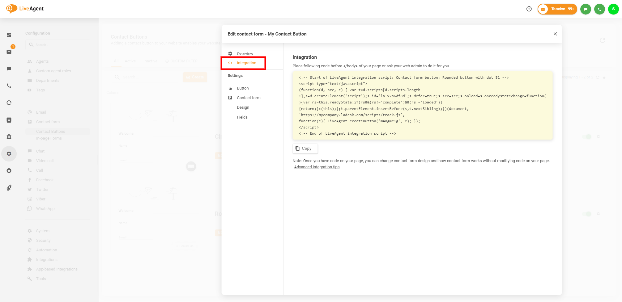 お問い合わせボタンをウェブサイトに設置するには、Integration(インテグレーション)セクションに移動し、インテグレーションスクリプトをコピーして、ウェブサイトの </body> HTMLタグの直前(例:フッター内)にコードを貼り付けてください。