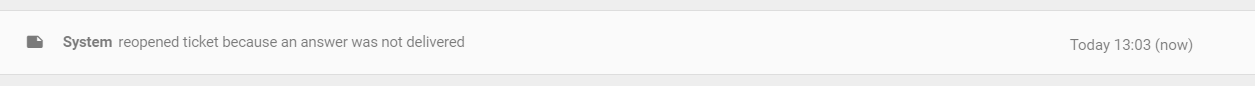 顧客に回答を配信できなかった場合、チケットは自動的に再オープンされ、「System reopened ticket because an answer was not delivered」というシステムノートが追加されます。 これにより、配信レポートを確認することができます。配信レポートはエージェントを含むすべてのユーザーが利用可能です。