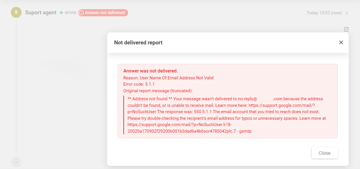 - Answer not delivered(未配信) - 受信側のメールサーバーが受け付けなかったため、エージェントの返信を配信できなかったことを示します