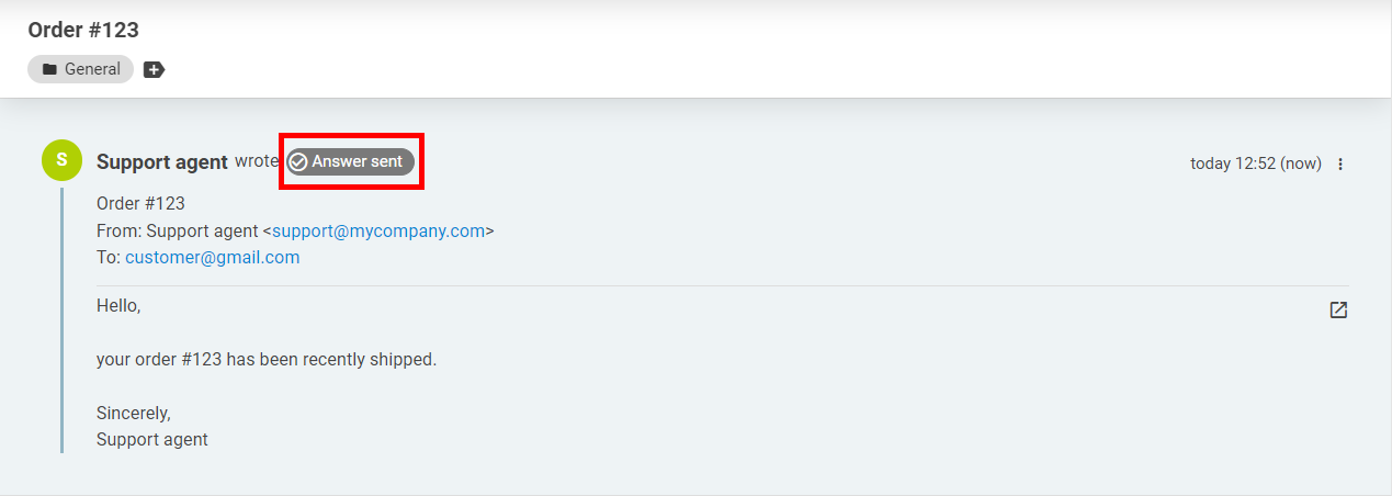 - Answer sent(送信済み) - エージェントの返信が送信メールアカウントのサーバーによって送信受付済みであることを意味します