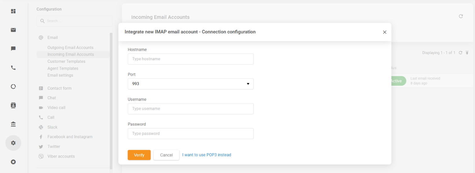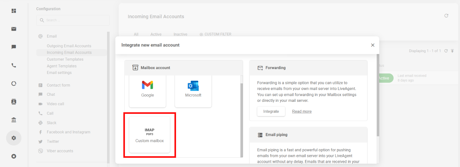 LiveAgentアカウントで、Configuration(設定) > Email(メール) > Incoming Mail accounts(受信メールアカウント) に移動し、“Integrate new email account”(新しいメールアカウントを統合) ボタンをクリックします。