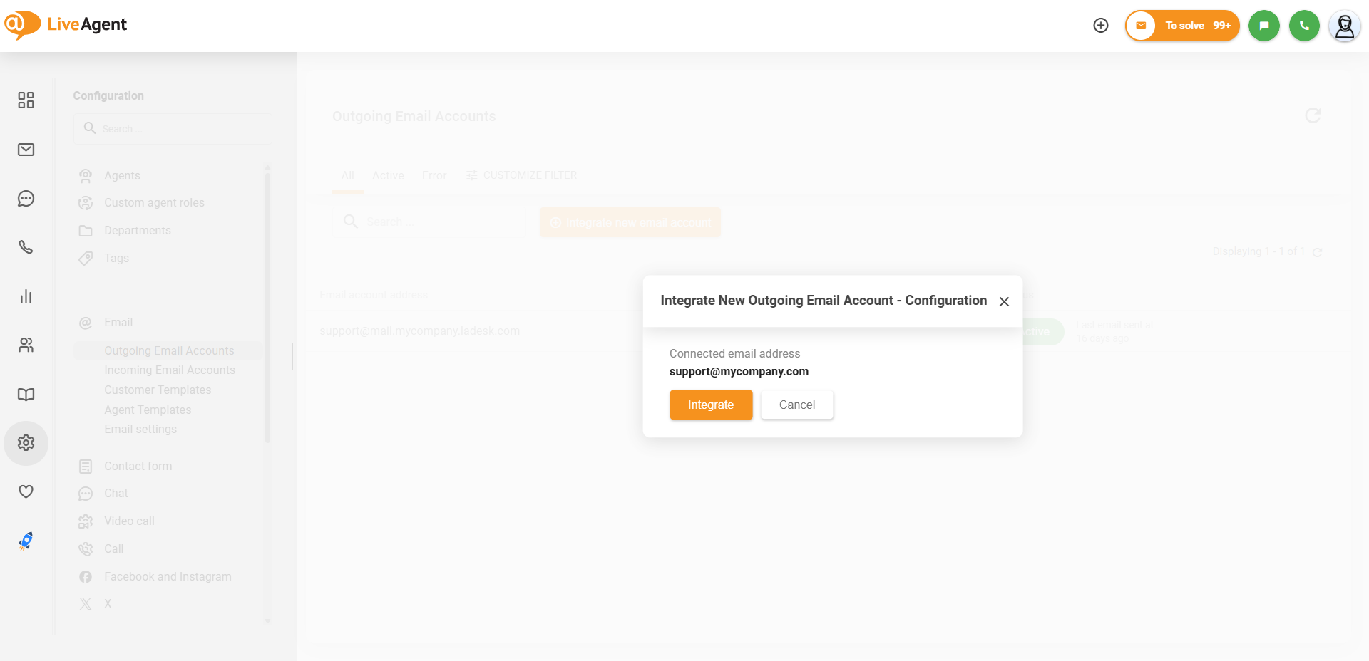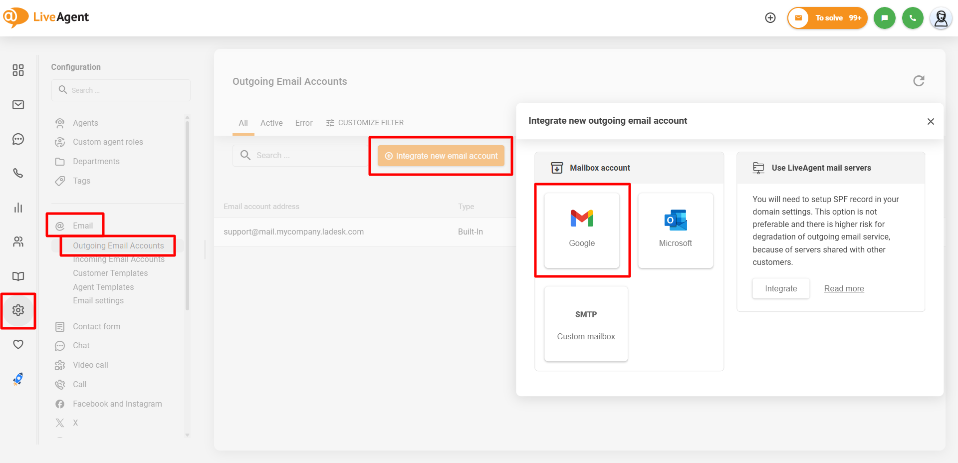 LiveAgentにGoogleアドレスを接続してメールを送信できるようにするには、Configuration(設定)> Email(メール)> Outgoing Mail accounts(送信メールアカウント)に移動し、“Integrate new email account”(新しいメールアカウントを統合)をクリックして、接続ウィンドウで「Google」コネクターを選択します。