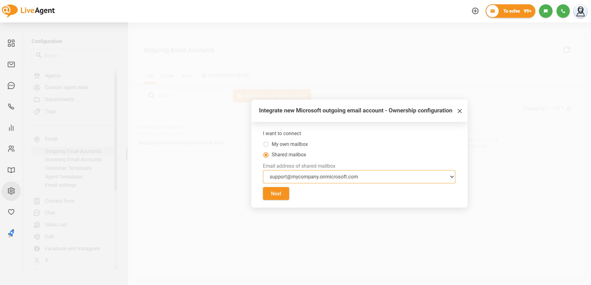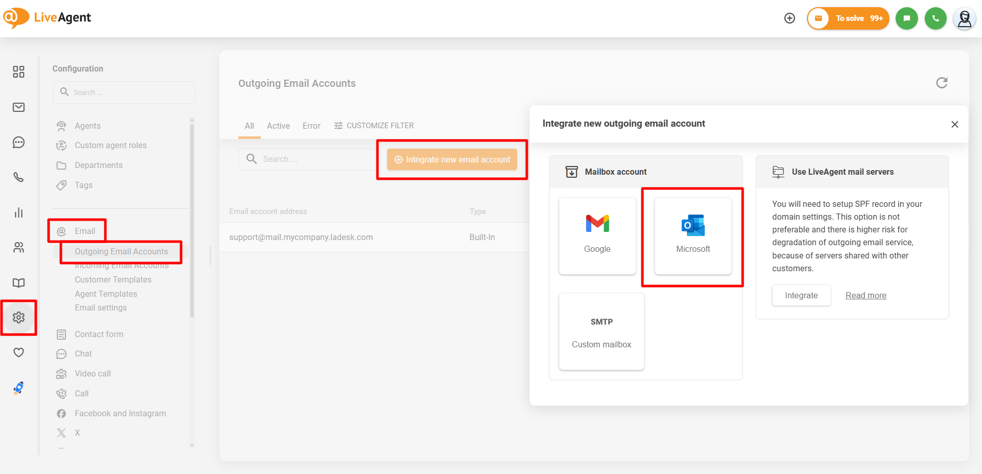 Microsoft共有メールボックスをLiveAgentに接続してメールを送信できるようにするには、**Configuration(設定) > Email(メール) > Outgoing Email Accounts(送信メールアカウント)**に移動し、“Integrate New Email Account”(新しいメールアカウントを統合)をクリックして、接続ウィンドウで"Microsoft"コネクターを選択します。
