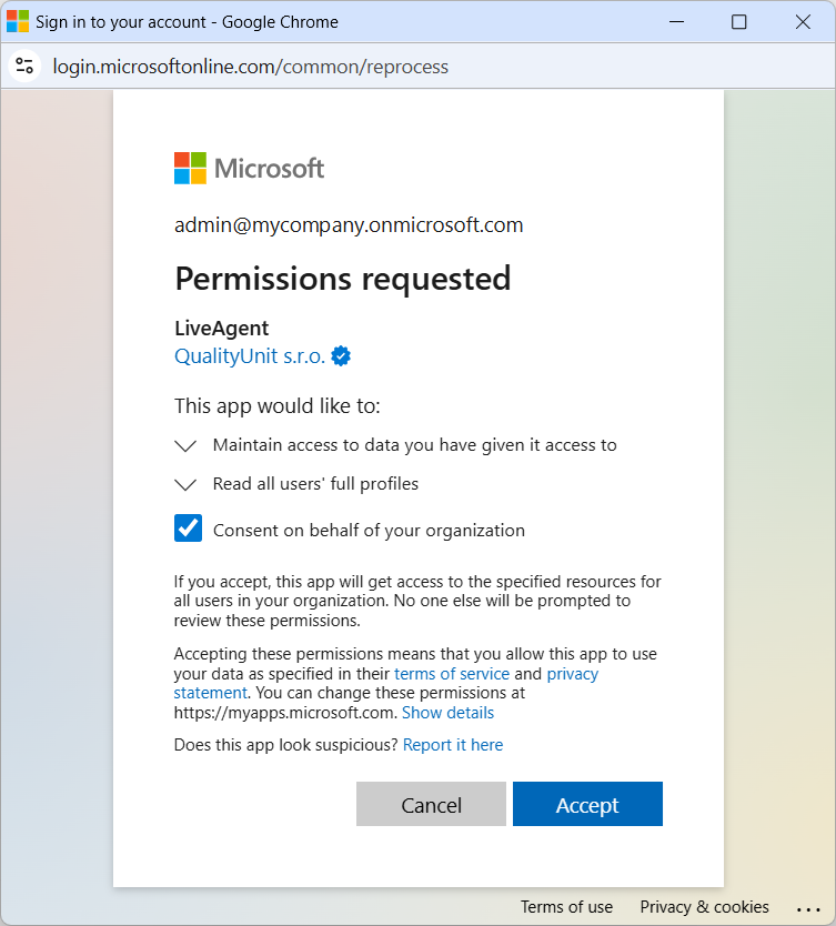 Microsoft Global Admin(グローバル管理者)は、すべてのMicrosoftユーザーが共有メールボックスをLiveAgentに接続できるよう、LiveAgentにテナント全体の同意を付与することができます。この同意は、認証ウィンドウからすぐに付与できます。