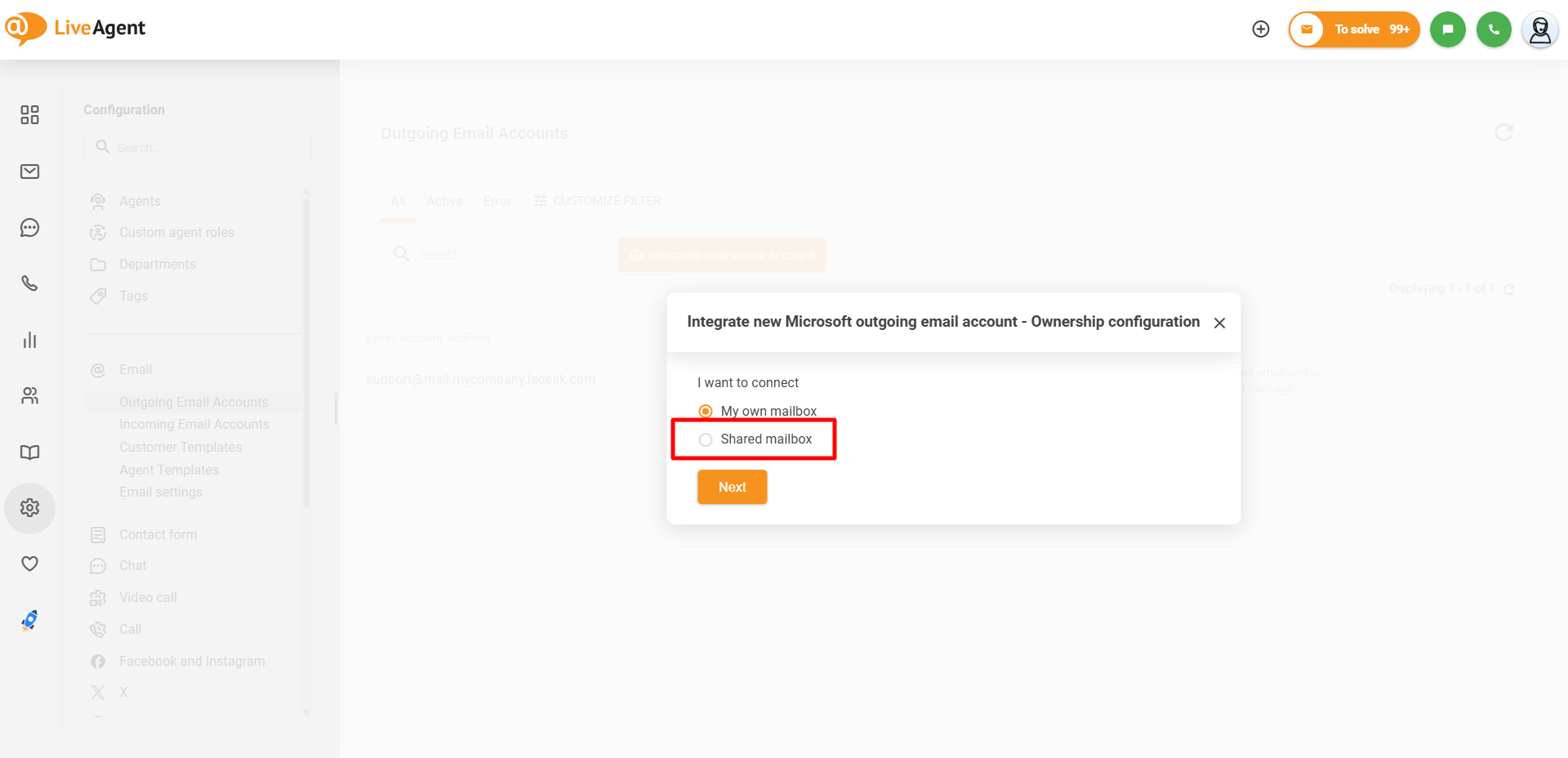 同意が付与されると、LiveAgentの送信メールアカウントとして接続したい共有メールボックスを選択できるようになります。